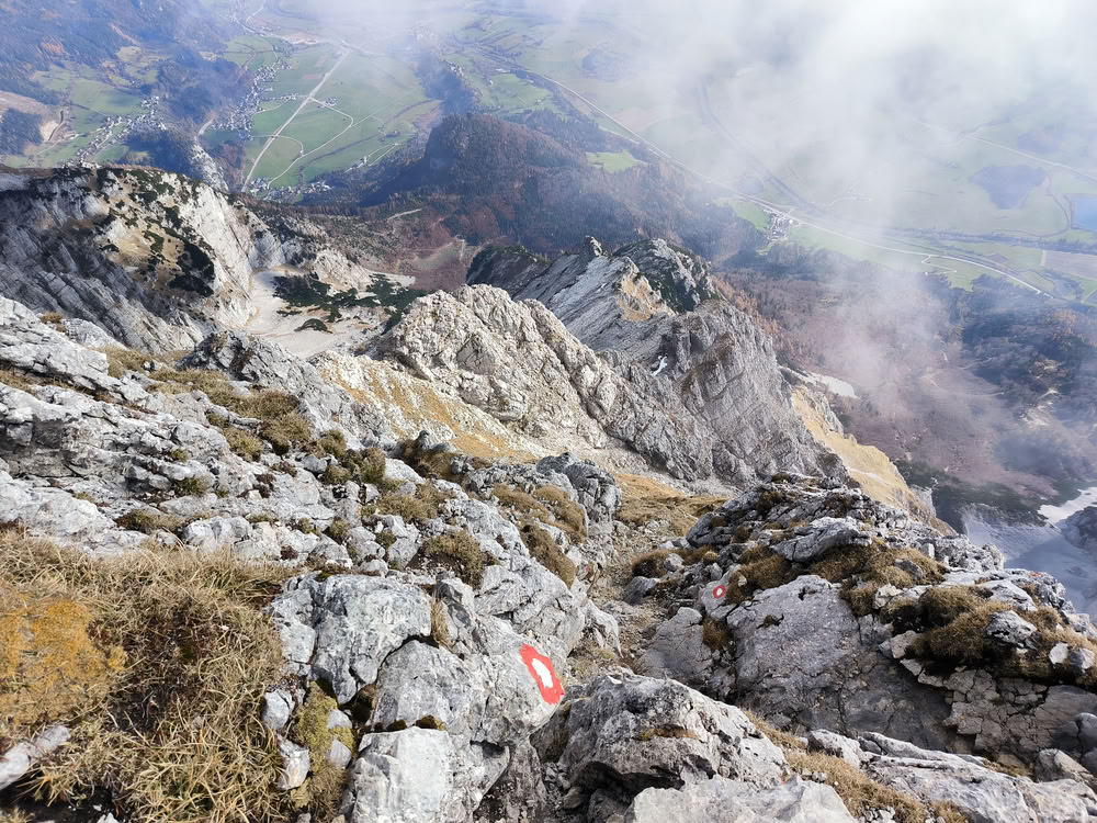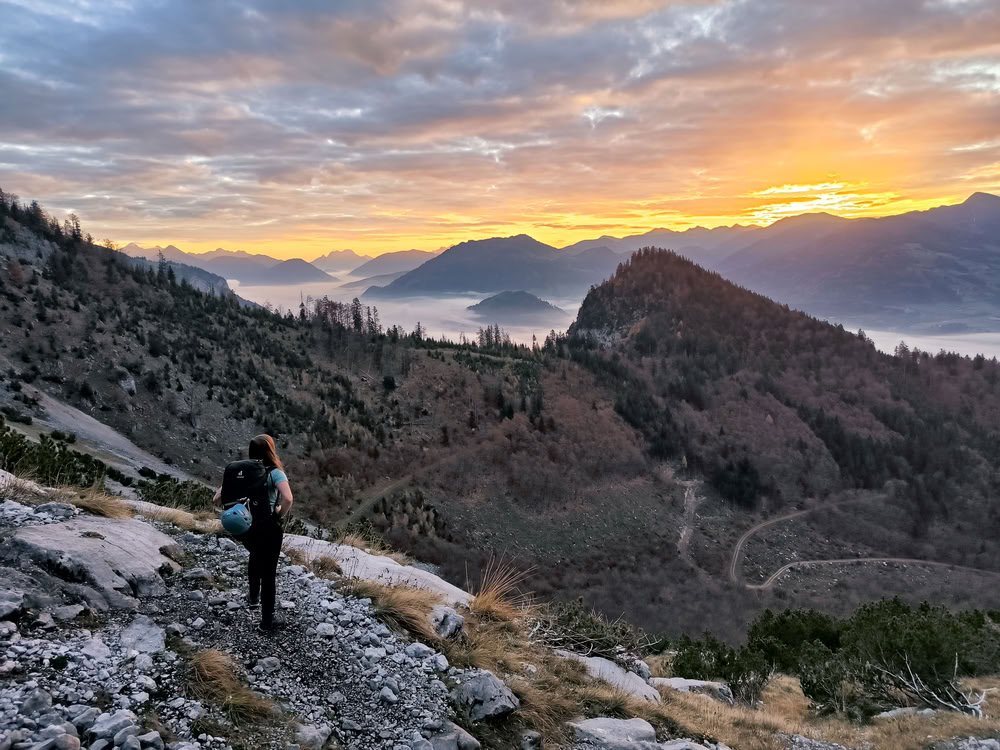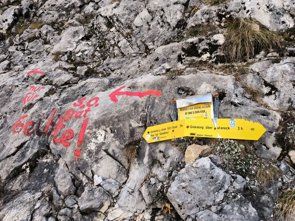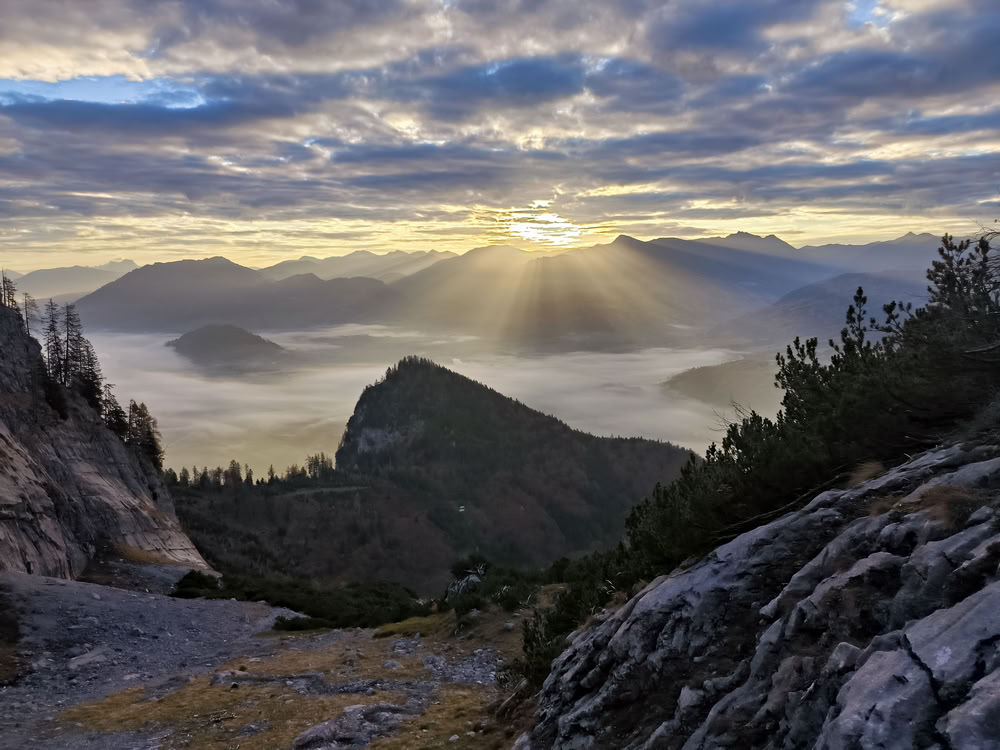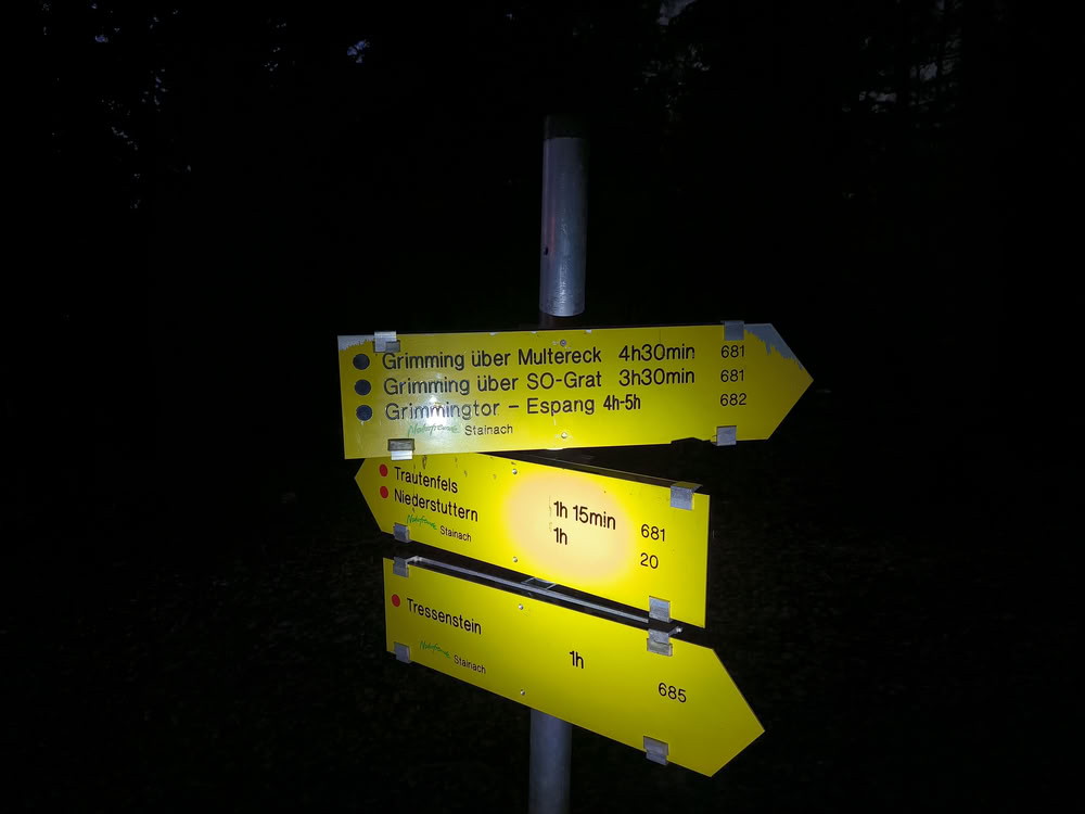Uběhly další dva roky, než jsem se vrátil na místo činu do údolí řeky Enns. Byl konec října. Dny jsou krátké a proto zazvonil budík ve čtyři ráno, abychom byli s Verčou v osadě Niederstuttern alespoň kolem páté ráno. Nakonec bylo dobře, že byla tma jako v pytli a my neviděli z parkoviště ten propastný výškový rozdíl mezi námi a vrcholem. Za svitu čelovek jsme po úzkém chodníku lesem pomalu ukrajovali z rozpočtu 1700 metrů převýšení. Ještě za tmy jsme minuli chatu Grimminghütte, která je situovaná oproti vrcholu propastně nízko. Kousek za ni jsme začali vystupovat z lesa a před námi se ze tmy vynořili bíle vápencové skalní útesy. Do cesty se nám postavila první lehčí lezecká pasáž. Za ni jsme zastihli velmi nádherný, řekl bych až dramatický východ slunce s lehkou inverzí v údolí. Poté následovalo stoupání k rozhodujícímu rozcestníku.