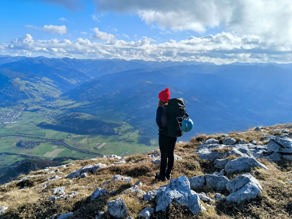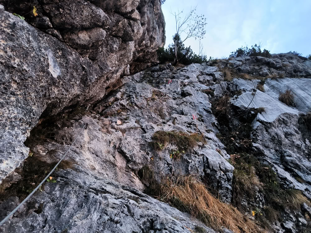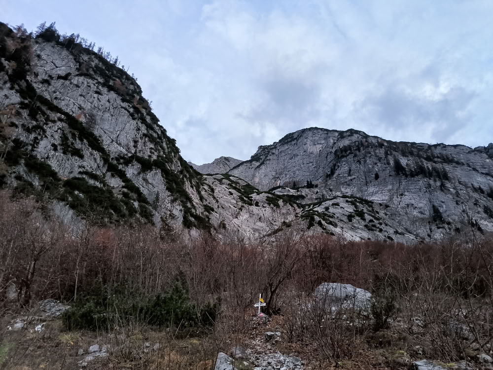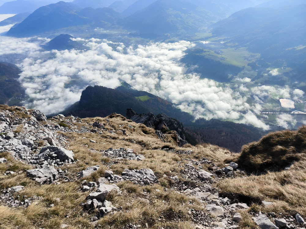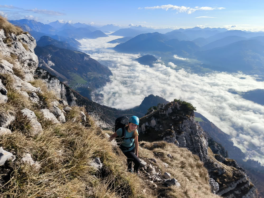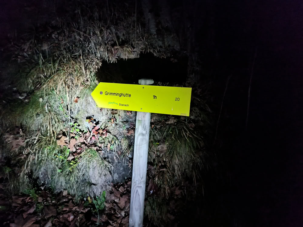 Uběhly další dva roky, než jsem se vrátil na místo činu do údolí řeky Enns. Byl konec října. Dny jsou krátké a proto zazvonil budík ve čtyři ráno, abychom byli s Verčou v osadě Niederstuttern alespoň kolem páté ráno. Nakonec bylo dobře, že byla tma jako v pytli a my neviděli z parkoviště ten propastný výškový rozdíl mezi námi a vrcholem. Za svitu čelovek jsme po úzkém chodníku lesem pomalu ukrajovali z rozpočtu 1700 metrů převýšení. Ještě za tmy jsme minuli chatu Grimminghütte, která je situovaná oproti vrcholu propastně nízko. Kousek za ni jsme začali vystupovat z lesa a před námi se ze tmy vynořili bíle vápencové skalní útesy. Do cesty se nám postavila první lehčí lezecká pasáž. Za ni jsme zastihli velmi nádherný, řekl bych až dramatický východ slunce s lehkou inverzí v údolí. Poté následovalo stoupání k rozhodujícímu rozcestníku.