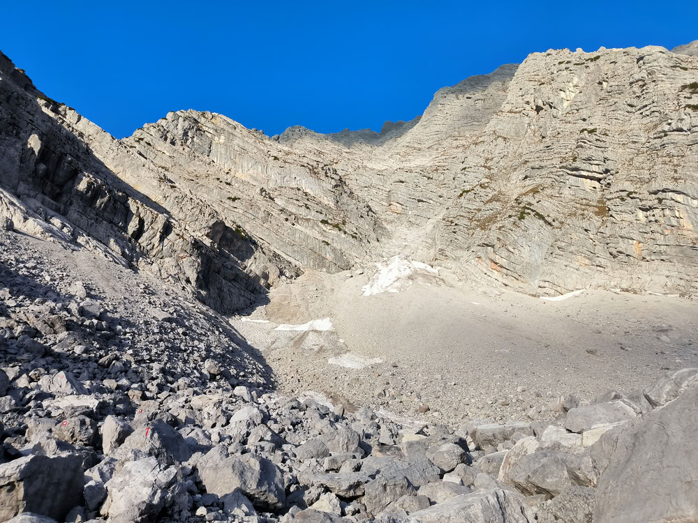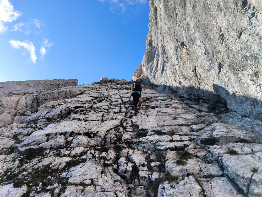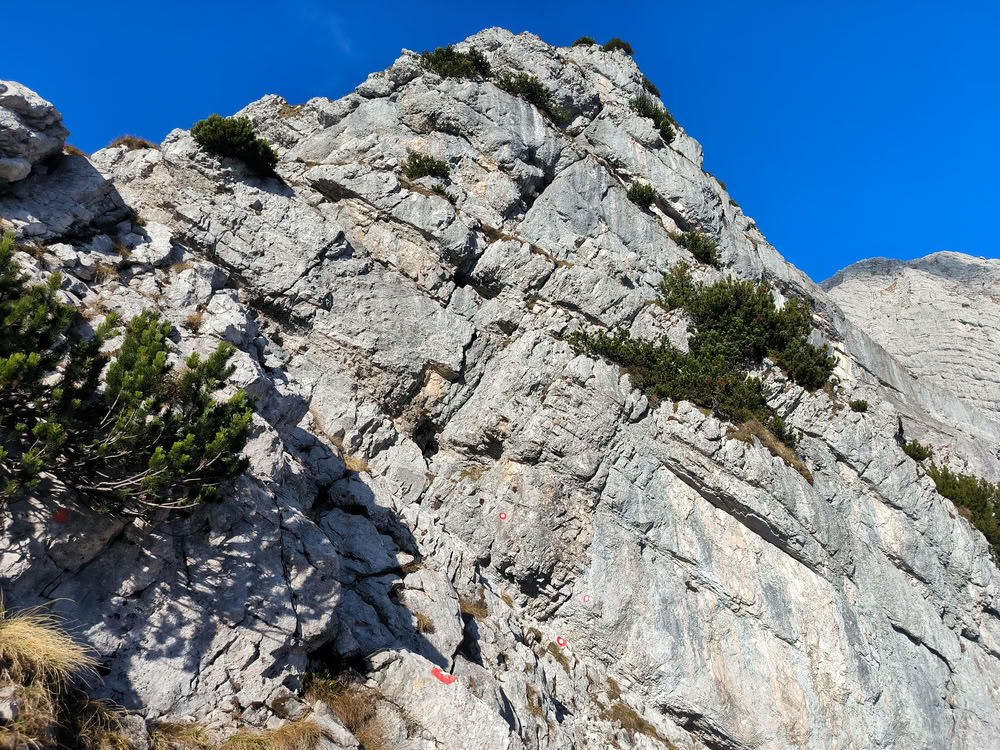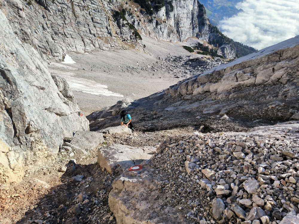 Na rozcestí je několik upozornění odrazující méně zkušené nebo běžné turisty před variantou vlevo. Uvádí se zde "at one's own risk" a dále na směrovce udávající čas výstupu přes Südostgrat 3 hodiny je poznámka Nur für geübte - tedy pouze pro zkušené. My jsme podle plánu zahnuli doleva a nabírali směr kotliny Schneegrube, za kterou začal nástup na hřeben. Ten zprvu vede dosti prudkým suťovištěm, kterému jsme se občas vyhnuli zleva po plotnách se žlábky. Nadějné lezecké pasáže však záhy vystřídala pro mě nejhorší část. Chodníček se totiž na nějakou dobu odpoutá od skal a klikatí se po úzce vyšlapané pěšince ve velmi prudkých travnatých svazích, které jsou v dolní části zakončené vysokými skalními srázy. Tady opravdu válet sudy nechcete. Verča však kráčela jistým krokem vstříc dalším částem hřebene Südostgrat.