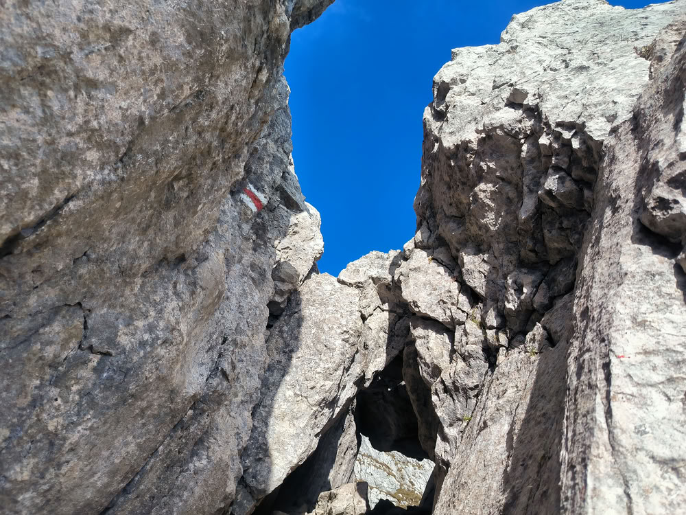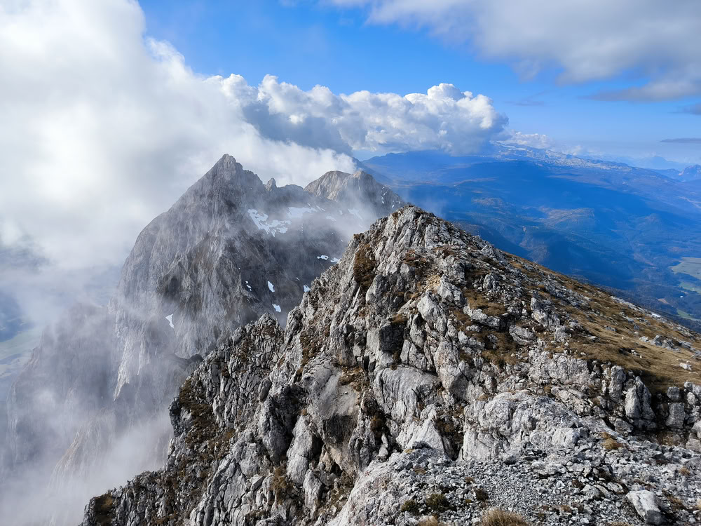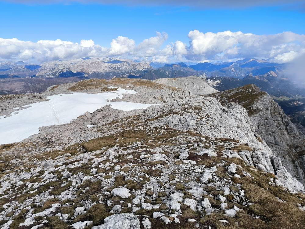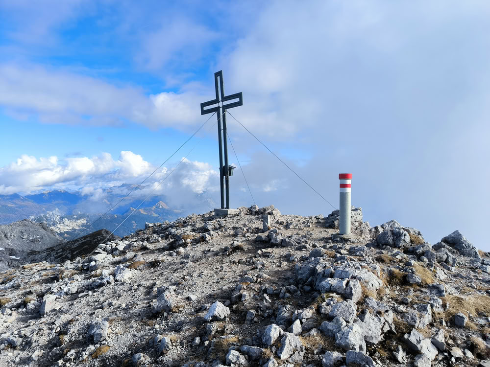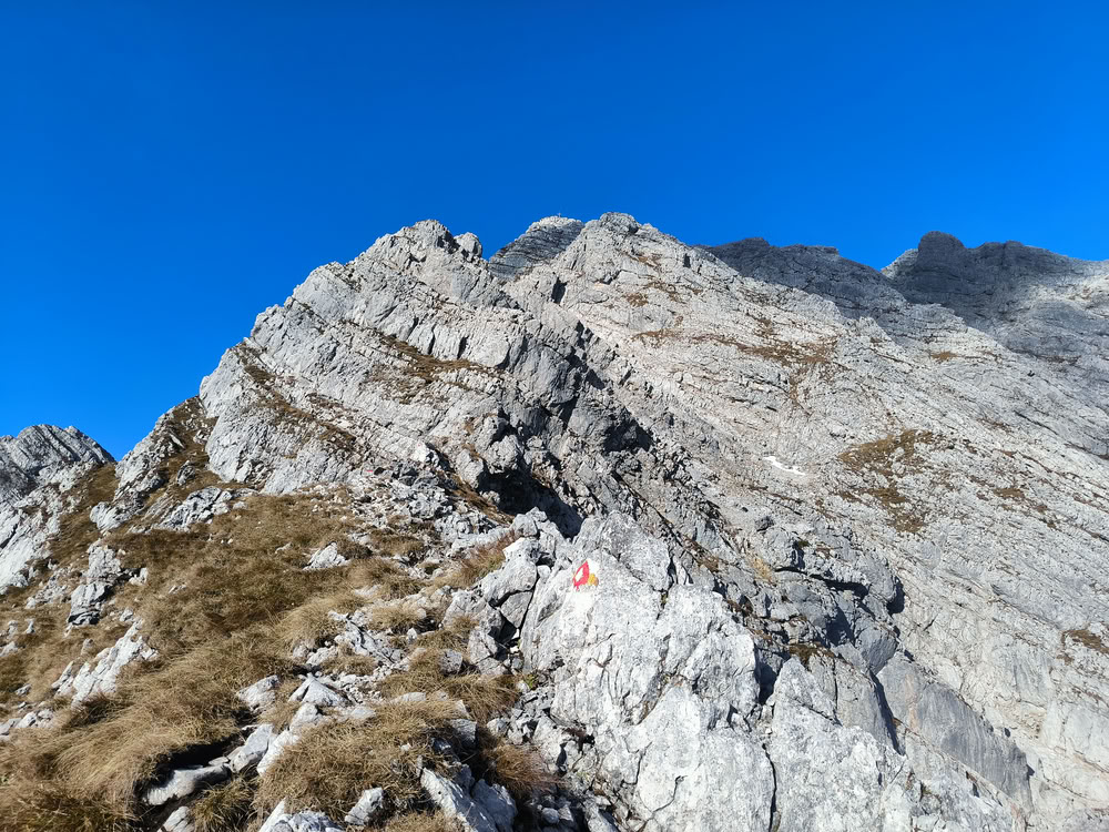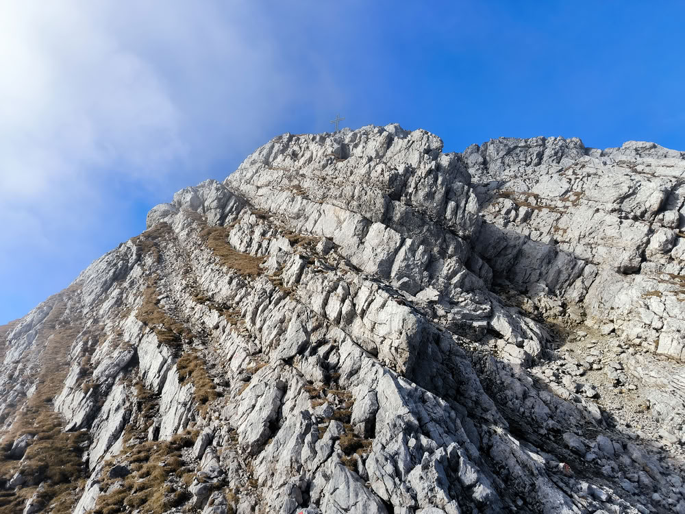 Byl jsem vcelku rád, když skončily trávy a konečně jsem v ruce zase mohl držet skálu. Poslední část hřebene je již čisté lezení úrovně I až II UIAA. Přelézá se několik věžiček a dokonce jeden menší komín. Vše je dobře označené a terče a šipky nás správně naváděly přímo po hřebeni, jindy tak trošku zprava. Pohled na poslední část vypadala vcelku hrozivě, ale zdání klame a najednou jsme se ocitli u vrcholového kříže. V této fázi jsme věděli, že nás čas moc netlačí a tak jsme si užívali vrcholu i výhledů z něj. Příjemný byl i následný kratší pochod po hřebeni směrem na vrcholek Multereck. Tam jsme si užili další krásné výhledy a zároveň jsme sledovali údolí, od kterého nás z Multerecku dělilo ještě přes 1500 výškových metrů.