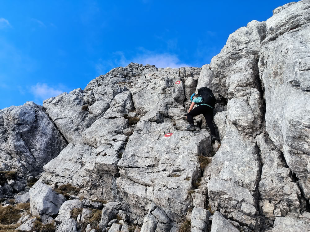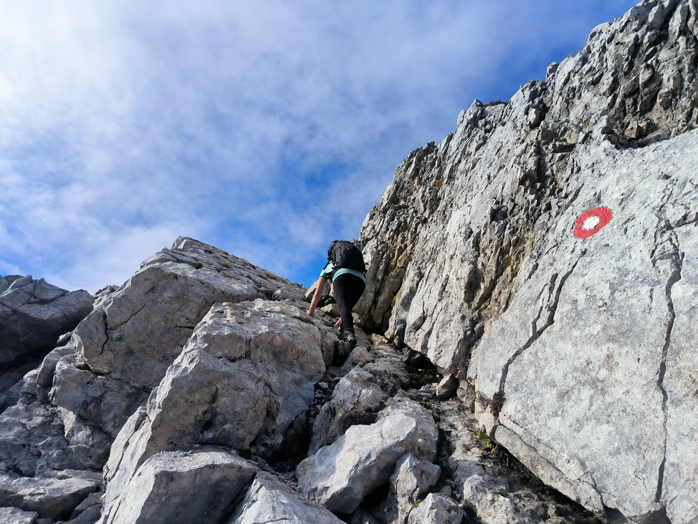 Z oné jihovýchodní strany se nabízí ještě jedna výstupová trasa pro zkušenější horaly a lezce - trasa vedoucí nezajištěným hřebenem Südostgrat s lezeckými pasážemi až obtížnosti II UIAA. A tou jsme se vydali i my. Na tuto trasu není potřeba žádné speciální lezecké vybavení, kromě přilby a obuvi, která drží na skále (trekovky, nástupovky ap.). Celý hřeben je dobře označený a orientace je proto snadná. Südostgrat ale vyžaduje jistý krok a alespoň nějaké zkušenosti s přelezem skal. Nejsou zde žádná jistící lana, leze se pouze po svých. Expozice až na nějaké úseky není nijak závratná a lezení je lehké, jako nejtěžší úsek se uvádí snad dva nebo tři metry vysoký komínek za II UIAA.
