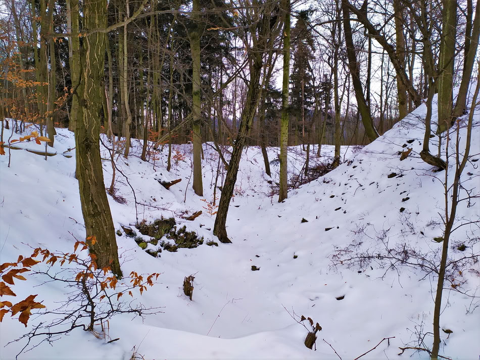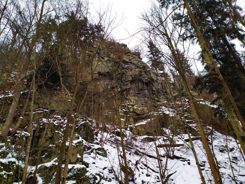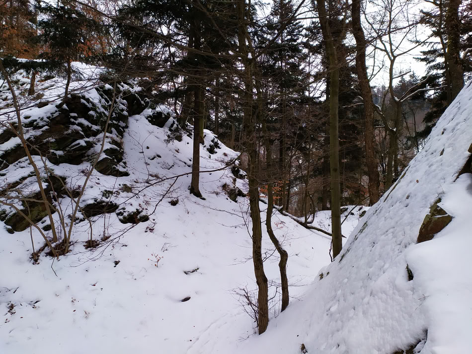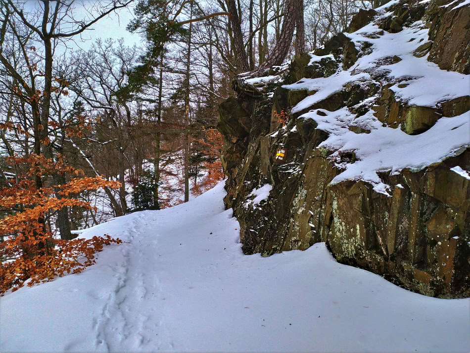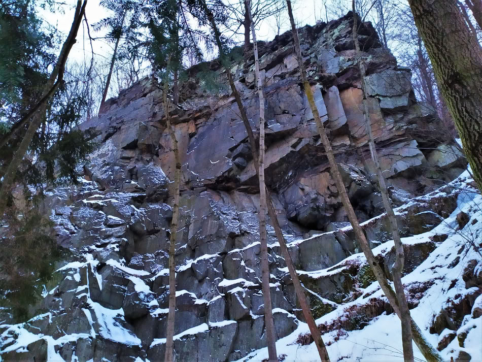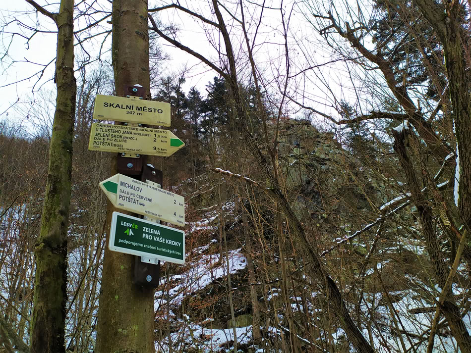 Z Potštátu není nutné se vracet zpět po stejné žluté, ale lze vyrazit po červené do malé osady Michalov, odkud sestupuje zelená značka do údolí Veličky. Celé údolí potoku Veličky se vyznačuje četnými útesy a skalními stěnami z vrstevnaté břidlice. Celek se nazývá Potštátské skalní město a nejvýraznější jsou Horní a Dolní (Staré a Nové) skály. Tyto dvě skály jsou využívané horolezci. Zelená vede údolím po hlavní silnici zpět k Boňkovu pod hrad Puchart. V zimě můžeme obdivovat několik menších ledopádů tvořících se na skalních stěnách podél cesty. U některých skalních útvarů je jasně viditelné, jak vrásy břidlice mění svůj tvar i směr. Po celé délce údolí jsou ve skálách četné dutiny, které místní nazývali jako Trpasličí domečky. Lokalita je opředena i mnoha pověstmi o skrytých pokladech, které se otevírají na Velký pátek. Dávejte ale pozor, vaší chamtivost bude zkoušet skřítek Apella.