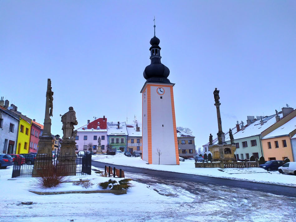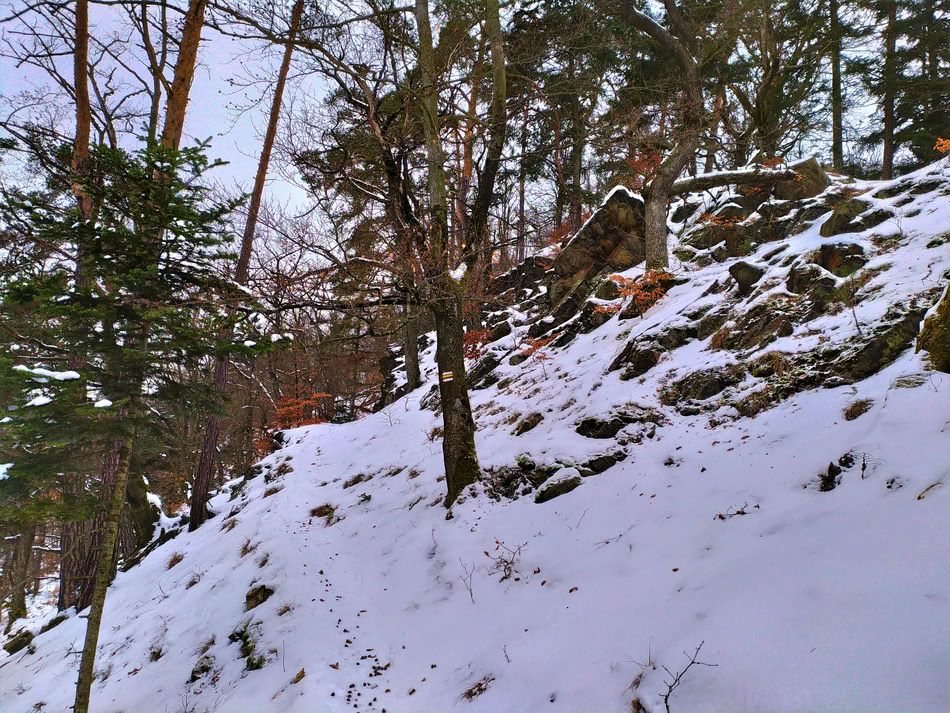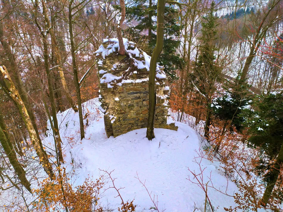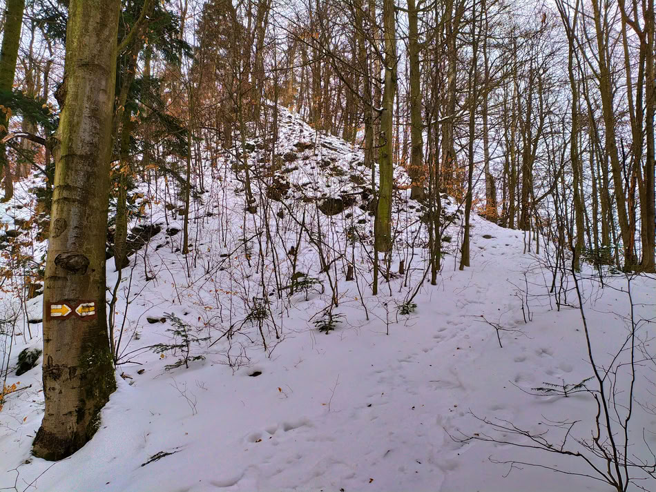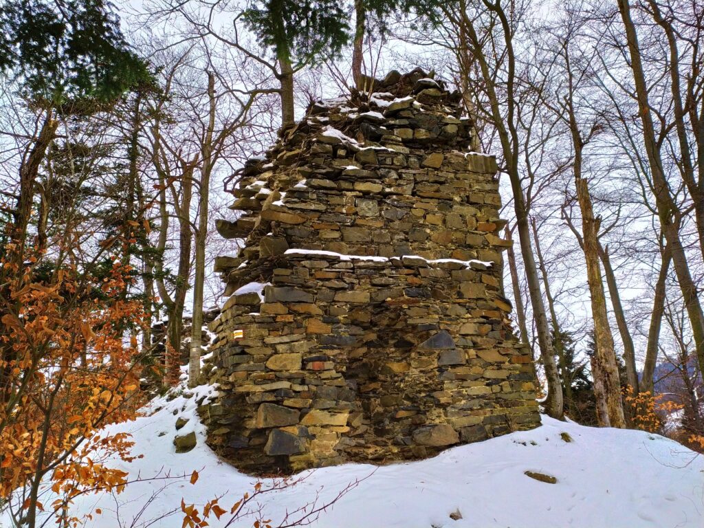 Od Puchartu pokračuje žlutá značka do horské obce Potštát (asi 6 km). Žlutá prochází lesy a loukami a míjí ještě jednu zříceninu, tentokrát rozhledny. Ta byla postavena v roce 1929 místním hrabětem Zikmundem Desfours – Walderode, který ji používal pro své potřeby pozorování. Na dnešních pozůstalých kamenných základech stávala kovová konstrukce a vyhlídková plošina se nacházela ve 28 metrech. Údajně bylo možné spatřit za dobré viditelnosti hřeben Nízkých Tater. Stržena byla v roce 1972. Městečko Potštát bylo založeno na přelomu 13. a 14. století. Za navštívení stojí Bočkovo náměstí. V jižní části se nachází zámek, který se nachází na místě původního hradu. Přestavba na zámek byla zahájena kolem roku 1600 v renesančním slohu. Poté, co zámek v roce 1813 vyhořel, byl přestavěn v empíru. Dnes v zámku sídlí obecní úřad, mateřská škola, knihovna a stála expozice dějin Potštátu. Nejvíc ovšem zaujme tzv. Hodinová věž uprostřed náměstí. Původně se jednalo o hlásku postavenou v roce 1700. Později byla přestavěna na hodinovou věž, jelikož ve věži kostela sv. Bartoloměje hodiny nejsou.