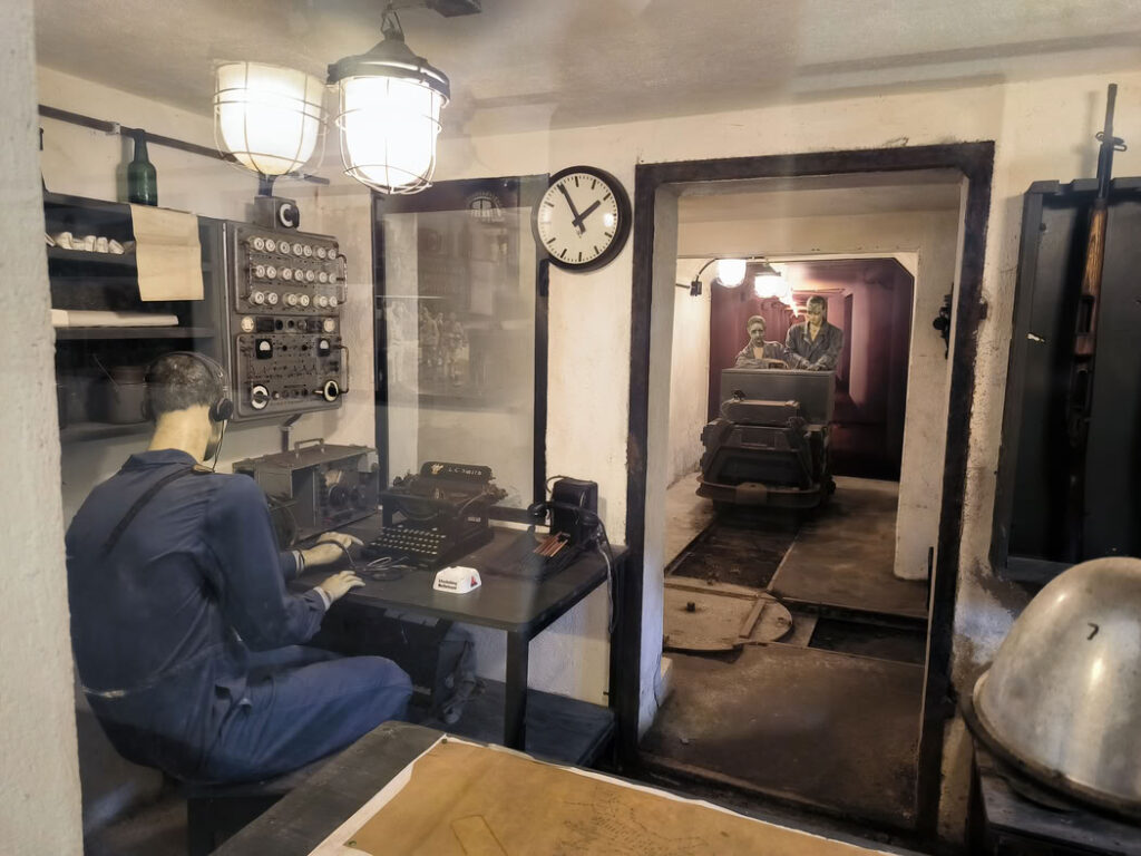 Za střelou je vstup do podzemí. Trasa je dlouhá přibližně 300 metrů. Hned za vstupem je aranžmá dobových situací – kancelář TODTu (firma mající pod palcem projektování a výstavbu Riese), figuríny SS a vězňů. Je zde vystaven i model létajícího talíře německé produkce a plně vyzbrojen. Další část je věnována zázračným zbraním Třetí říše s popisky v češtině. V závěrečné části podzemí si můžete projít cihlové tunely s držáky na vedení kabelů.