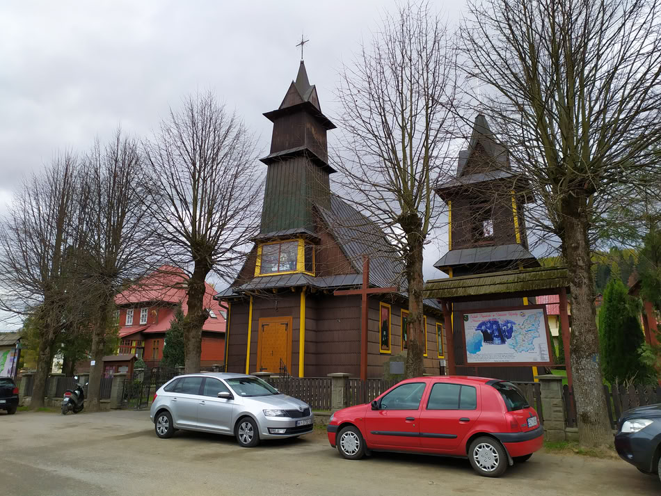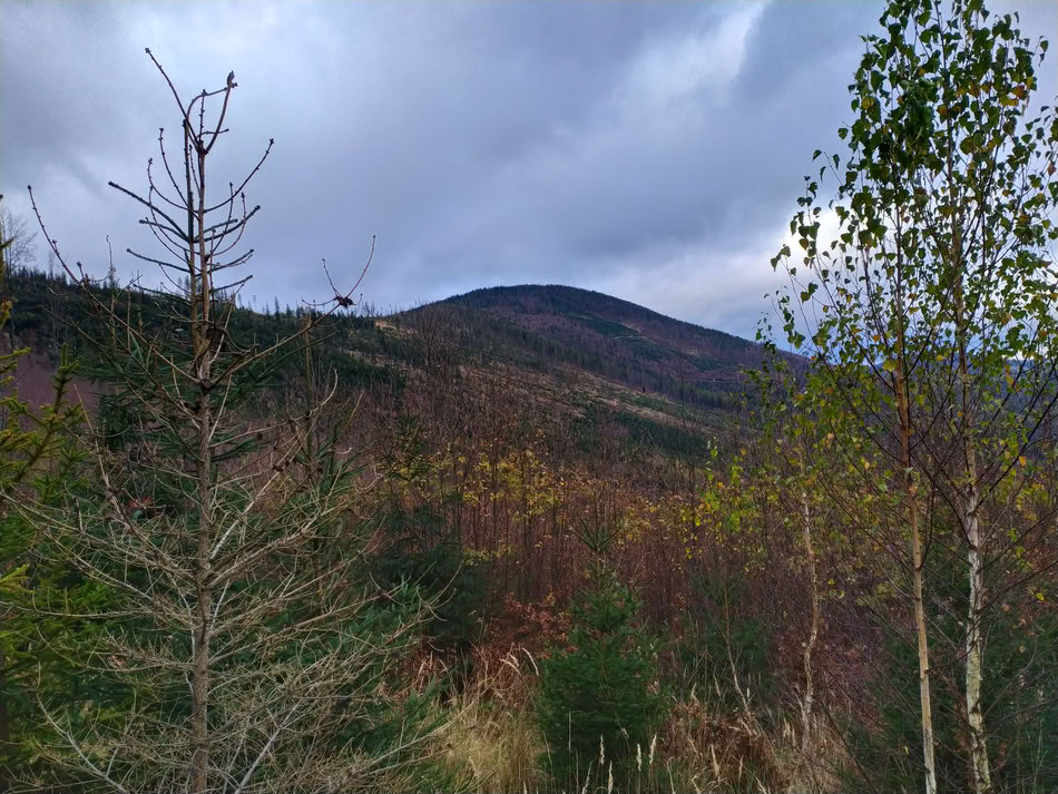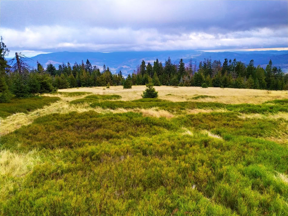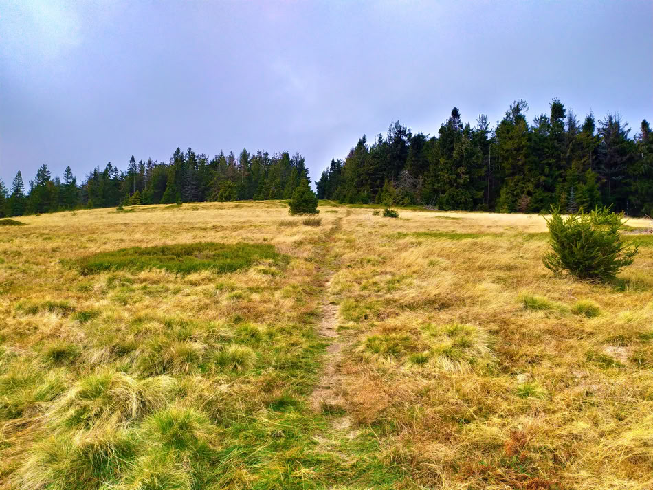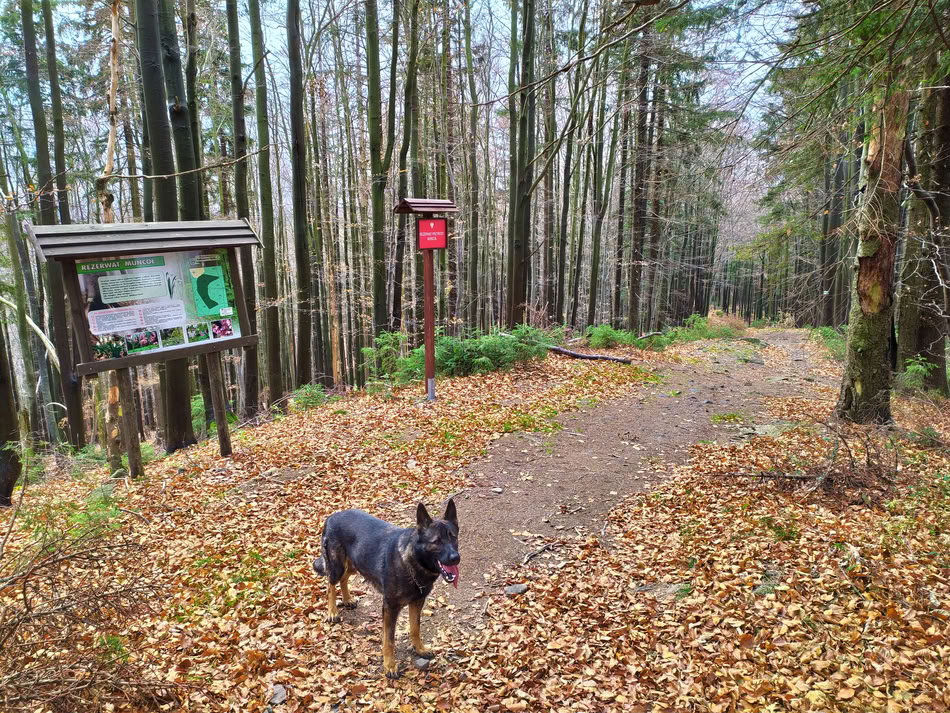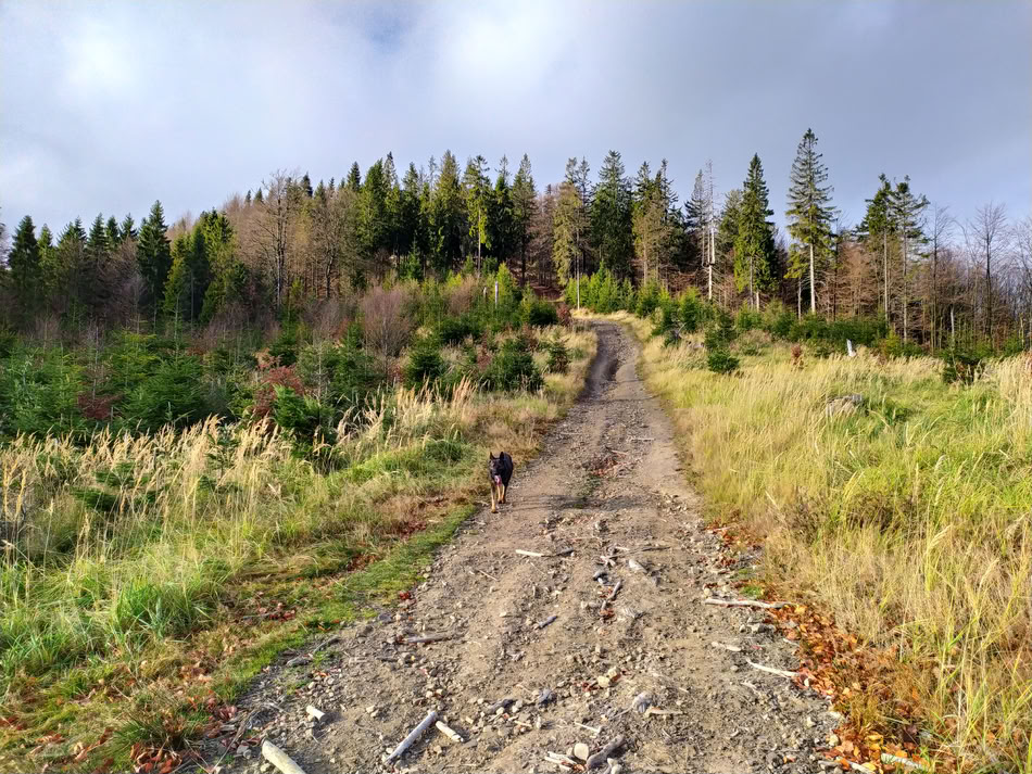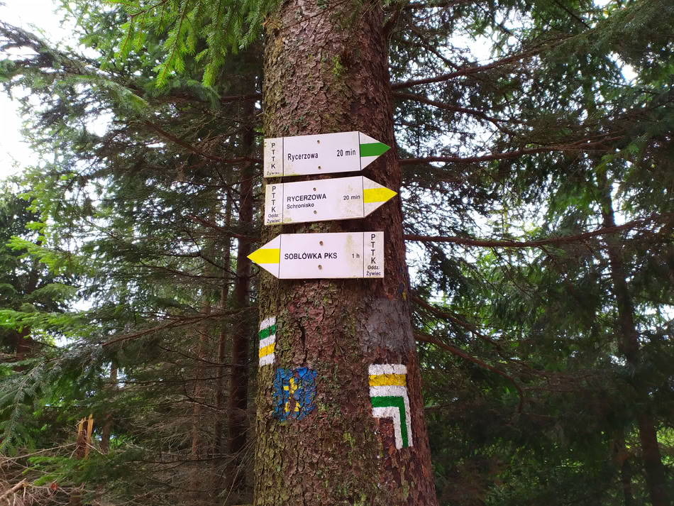 Na vrcholu se zelená značka stáčí prudce doleva a pokračuje tak po hřebeni směrem na Wielkou Rycerzowou. Na chvíli se opět prochází přes louku a následně se vstupuje do bukového lesa spadající pod rezervaci. Značka se celou dobu drží okraje této rezervace až do sedla Kotarz. Ze sedla je možnost sestoupit do Soblówky po modré. Okruh jsme si s Jerrym o něco prodloužili a sestoupili jsme do Soblówky po žluté, která je od Kotarze vzdálena cca 1,5 km dál po zelené. Po žluté již míjíme mnoho turistů – všichni směřují na chatu pod Rycerzowou. V Soblówce jsme se u dřevěného kostela se zvonicí napojili na asfaltovou silnici směřující zpět do Ujsół. Úsek po silnici měří asi 5 kilometrů. Cestou jsme měli zpestření v podobě obory s jeleny. Okruh je to velmi poklidný, téměř bez turistů. A asfaltová silnice není až tak frekventovaná.