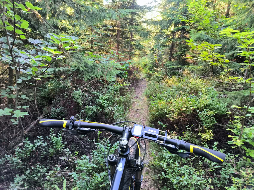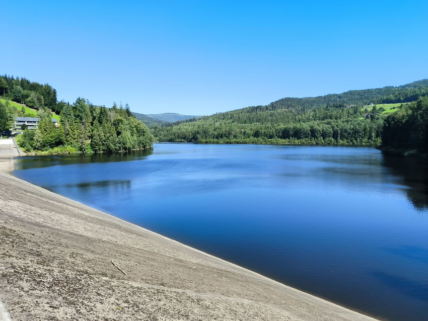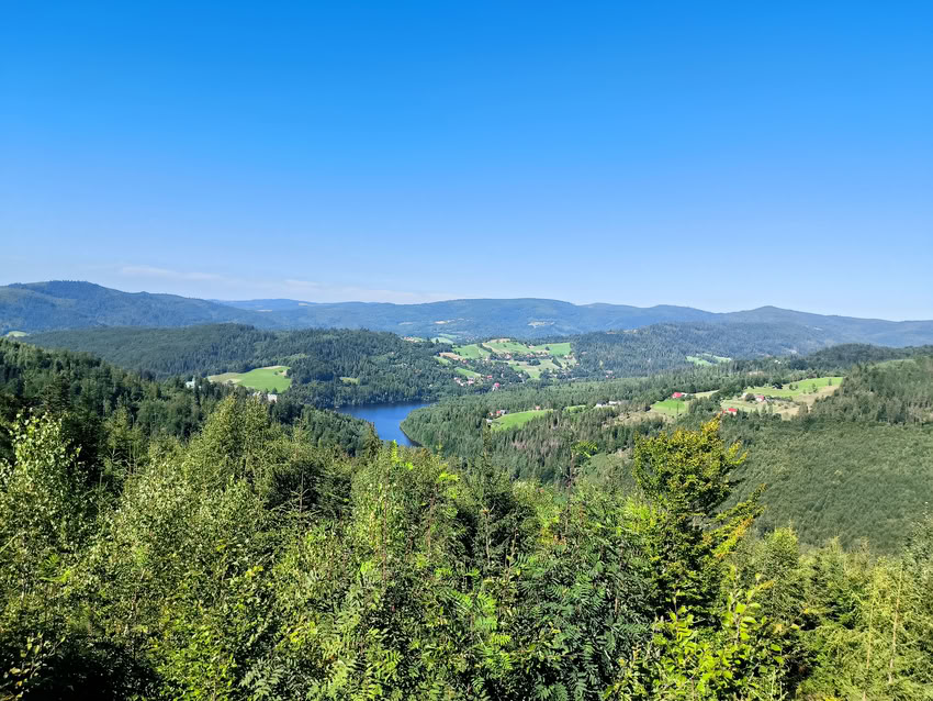 U odbočky k prameni jsem slavil předčasně. To nejhorší teprve následovalo. Chodník lesem po žluté je natolik úzký a navíc lemovaný borůvčím, že zde sotva projde někdo pěšky. A tak jsem se jen modlil, abych tady na někoho nenarazil, vypadal bych totiž jako blázen. U pramene jsem si za odměnu dal polskou "paczku" (koblihu), kterou jsem zakoupil v domácí pekárně ve Visle. Po nějaké chvíli odpočinku jsem namočil zadní kolo v prameni a započal další etapu výletu. Od pramene to šlo na kole rychle z kopce, až jsem se najednou ocitl u vodní nádrže Olše, která je hezky lemována horskými hřebeny a lesy. Od této chvíle jsem si cestu podél Olše náramně užíval, zejména za Istebnou vede cesta pěkným údolím. Na polské straně má řeka horský charakter a je škoda, že takto nevede po většinu své délky.
