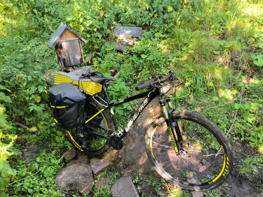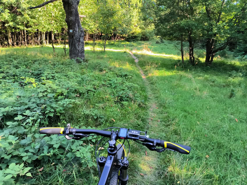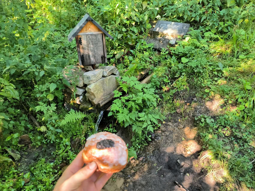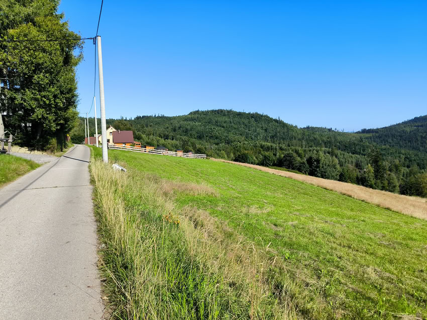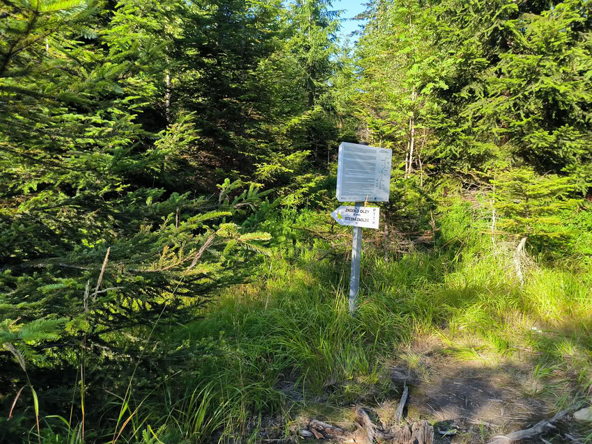 Po asfaltu to bylo ještě kousek pod vrcholem Beskidek (796 m) a přes horskou osadu Pietraszonka. Měl jsem v úmyslu z osady pokračovat po lesní cestě rovnou na hřeben na modrou značku, jenže u posledních domů mě zastavila závora s nápisem soukromý pozemek. A tak nezbývalo, než po zelené pěší tlačit kolo do prudkého kamenitého kopce k rozcestí Karolówka. Kdybych více před tím studoval mapy okolí, tak by mi nejspíš došlo, že k prameni to nebude vydlážděná široká cesta. A tak jsem v první fázi po modré přejížděl po balvanech a následně po zužujícím se chodníku v úbočí hory Gańczorka (909 m).