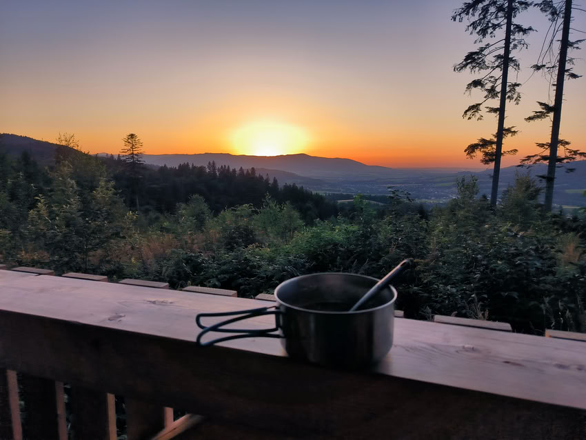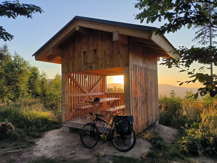 U Bukovce Olše opouští Polsko a začíná protékat aglomeracemi. A tady na prahu "Gorolie" jsem v sedm hodin večer řešil, zda pokračovat ještě kousek dál nebo raději hledat někde v lesích místo na přenocování. Rozhodl jsem se zůstat, neboť dál bych asi musel spát někde mezi domy. V mapě jsem našel útulnu Bukovec kousek od rozcestí Na Dílku. Od útulny mě však dělilo ještě 5 kilometrů s převýšením téměř 250 metrů. Zainvestovat sílu na překonání tohoto úseku se vyplatilo. Byl jsem odměněn krásným novým přístřeškem, odkud jsem během večeře sledoval západ slunce nad Beskydy. Ve druhém patře přístřešku se pohodlně vyspí 4 lidé a takový prostor jsem měl jen sám pro sebe.