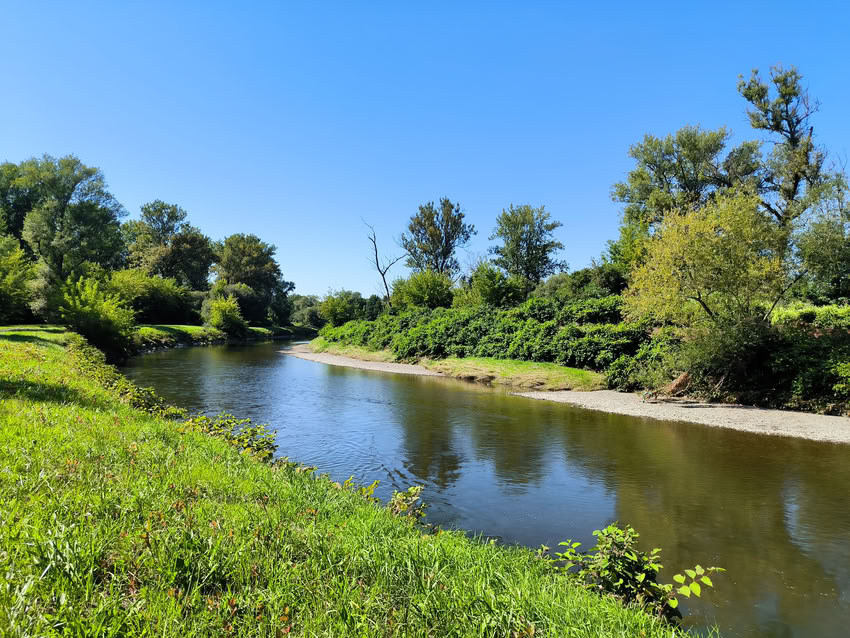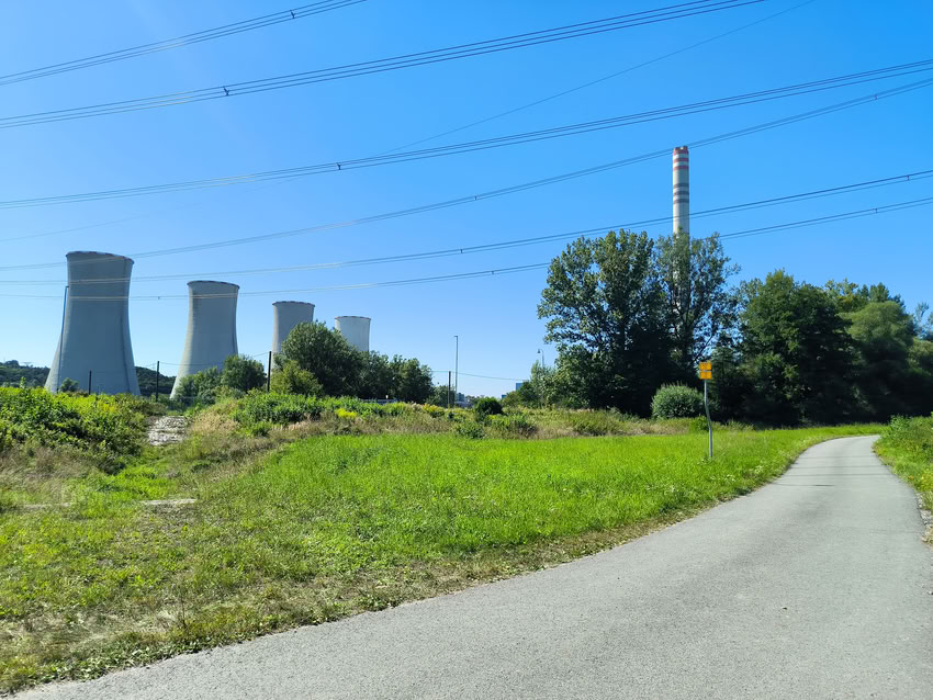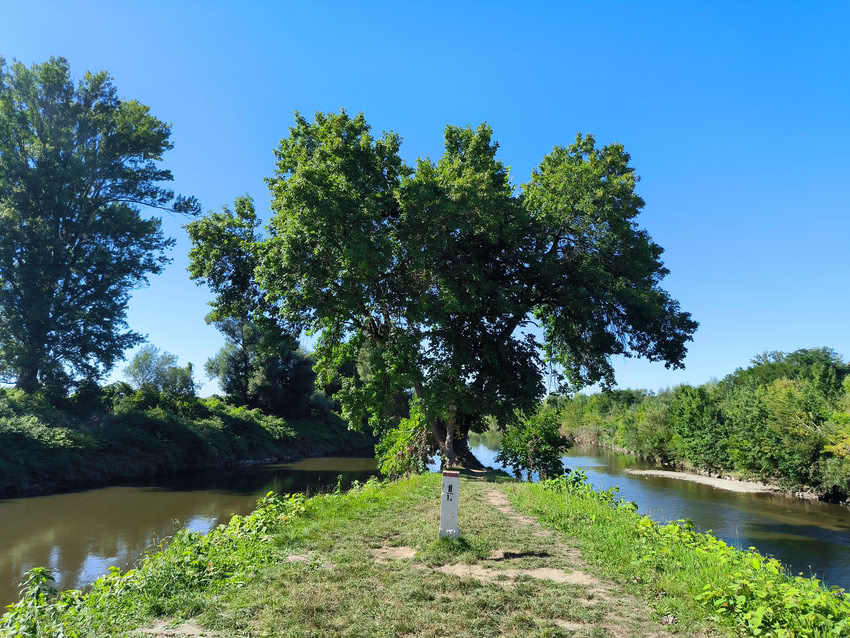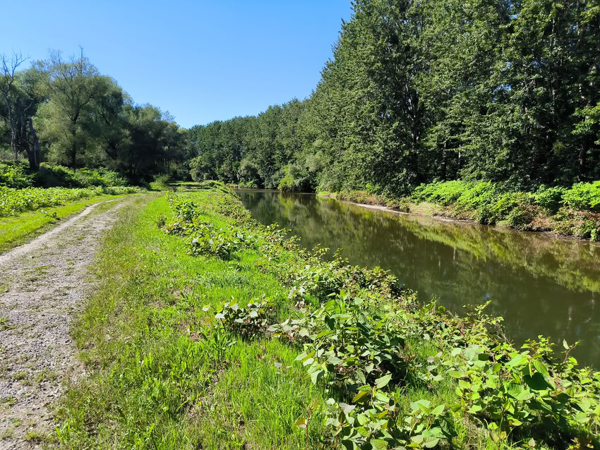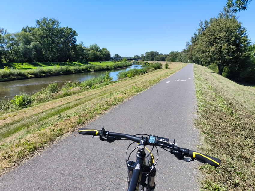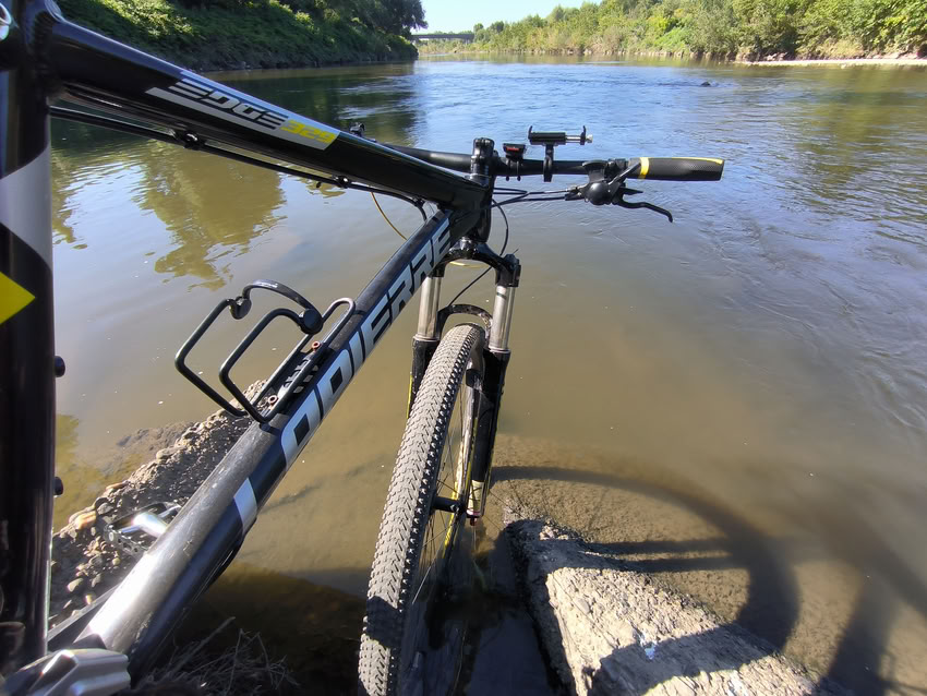 Po hodině a půl, během které jsem dostal základní lekce ze stavitelsví, lovu, chovu zvířat a pečení chleba se můj výlet schyloval k poslední etapě. Před Karvinou nastává nejpřívětivější část pro kolo. Až k Dětmarovicím kolem lázní Darkov se táhne asfaltová cyklostezka po náspu Olše. Za elektrárnou v Dětmarovicích končí asfalt a až k soutoku se dá vcelku pohodlně dojet po lesní cestě přímo podél řeky. Škoda, že většina cesty podél Olše nevypadá jako těchto závěrečných 10 kilometrů. U soutoku symbolicky namáčím přední kolo. Byl jsem opět rád, že zde nikdo není a nevidí mě. Není to žádná sranda z toho prudkého svahu vystrčit kolo do vody. Říkal jsem si, kdo případně doplave ke břehu dřív, jestli kolo nebo já.