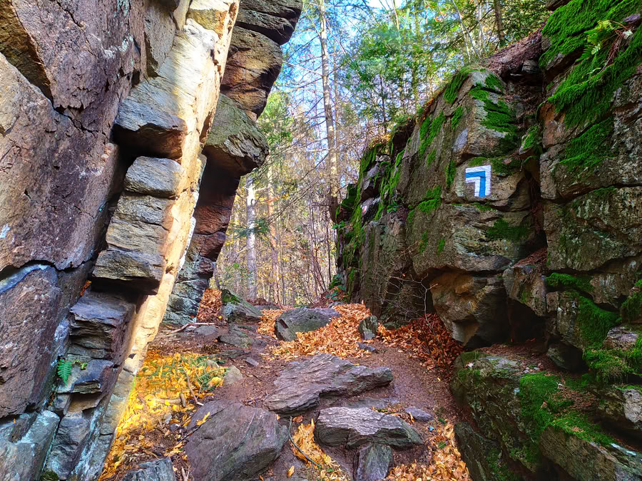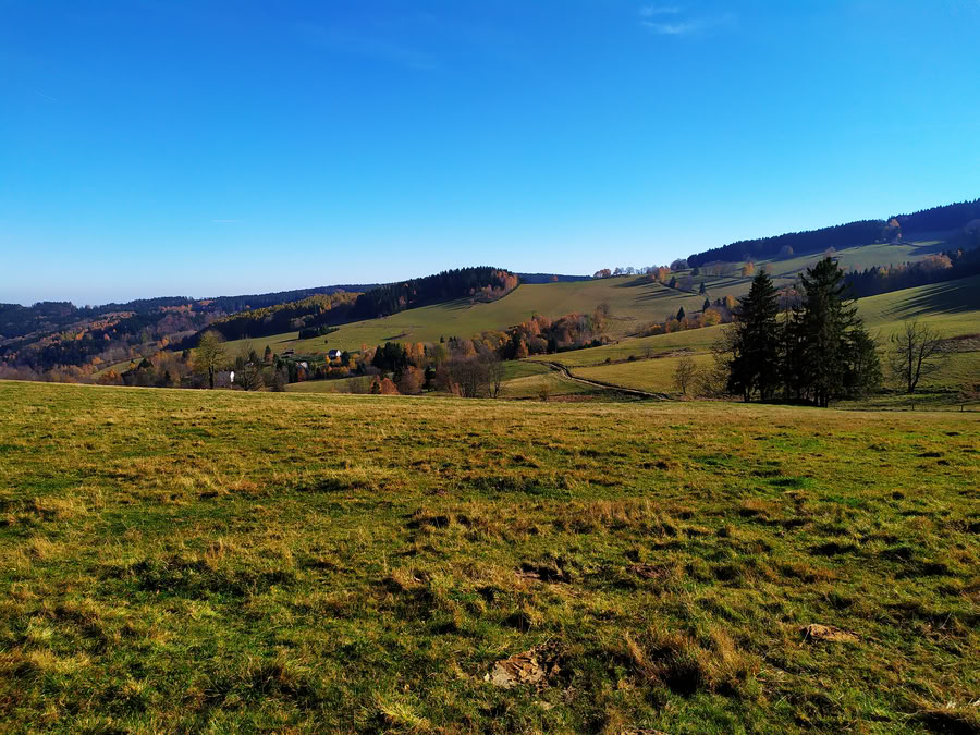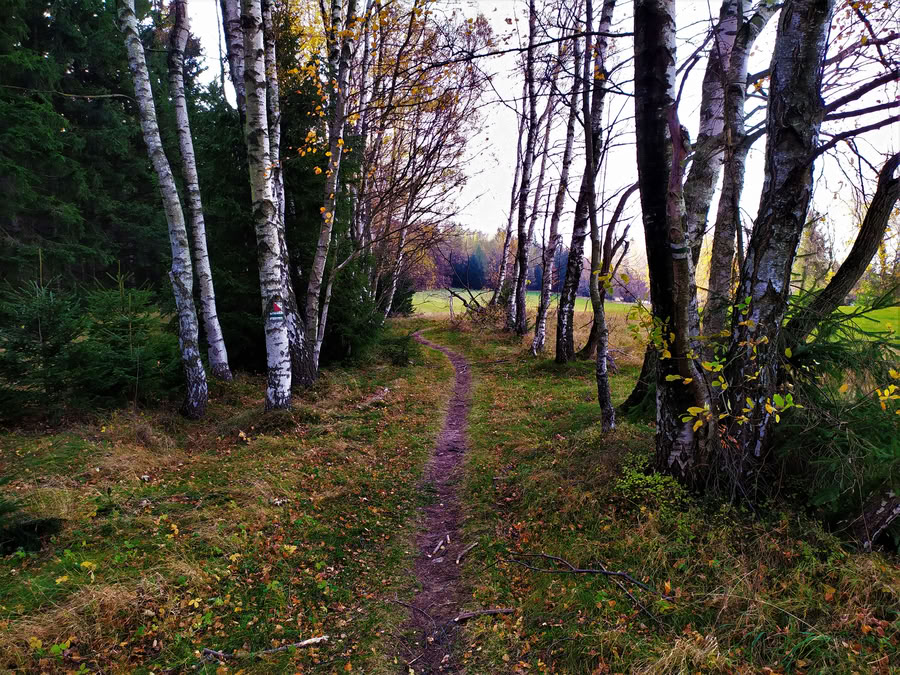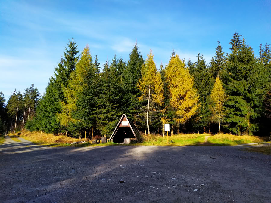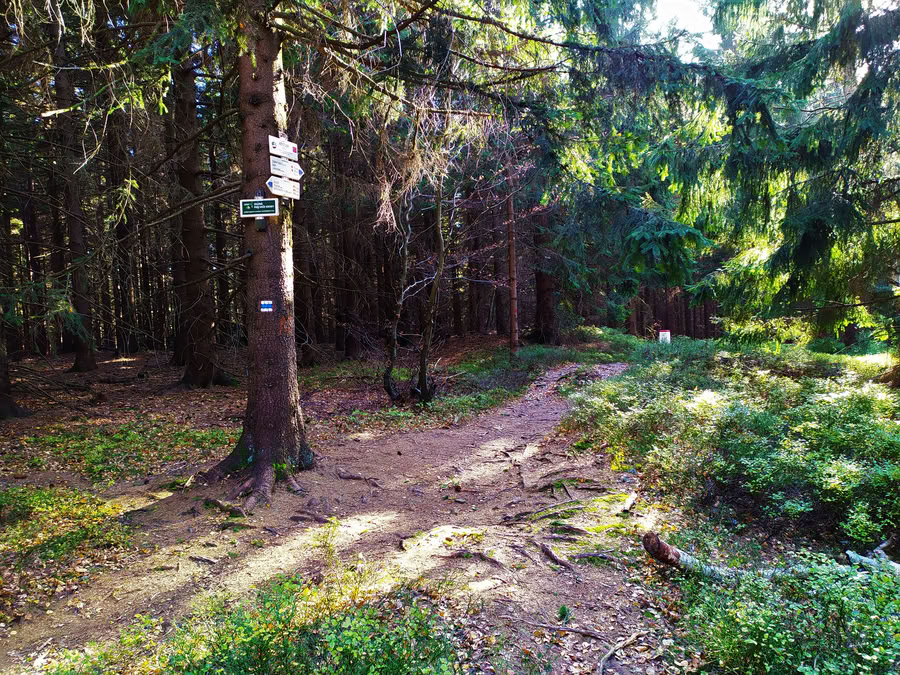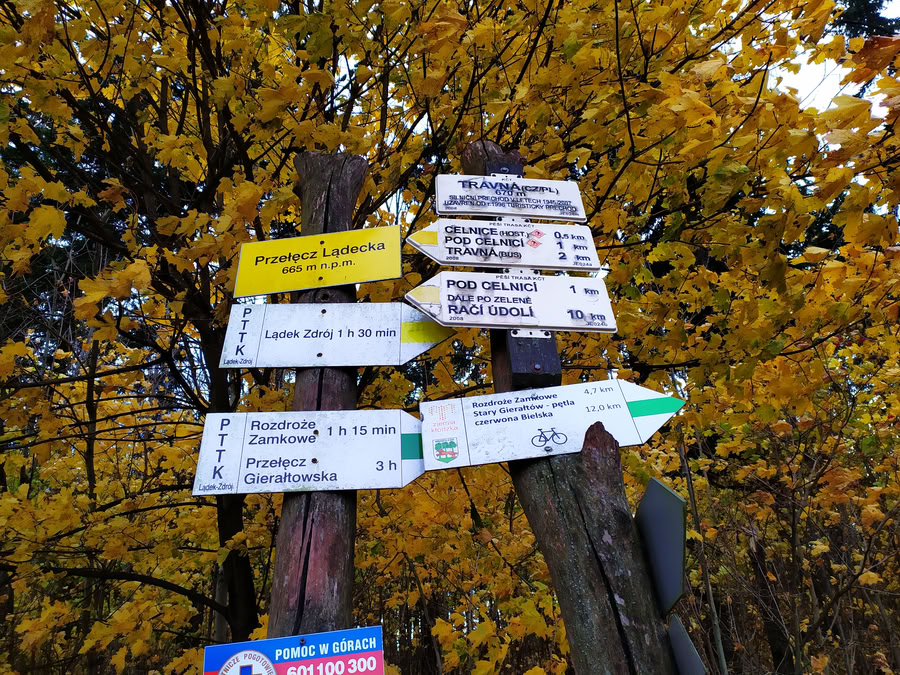 Zelená značka pak sestupuje od hradu na cestu a směřuje do sedla Černý kout (polsky sedlo Karpowska), kde tuto značku opouštíme a vydáme se po modré směr vrchol Koníček (850 m). Po cestě na vrchol narazíte na tabule informující o setkávání disidentů a pašování nelegálních tiskovin za socialismu v těchto místech. Za vrcholem se modrá stačí na naší stranu a prochází kolem menšího lesního baru u Stříbrného pramene. Tady můžete doplnit energii v podobě tyčinek nebo si vytáhnout plechovku z potoka. Modrá pak dále vede přes Zálesí a touto obcí podél krásných rychlebských luk. Zpět do Travné Vás dovede zelená značka, na kterou se napojíte u rozcestí Rozhraní. Do sedla je to z Travné po žluté asi kilometr.