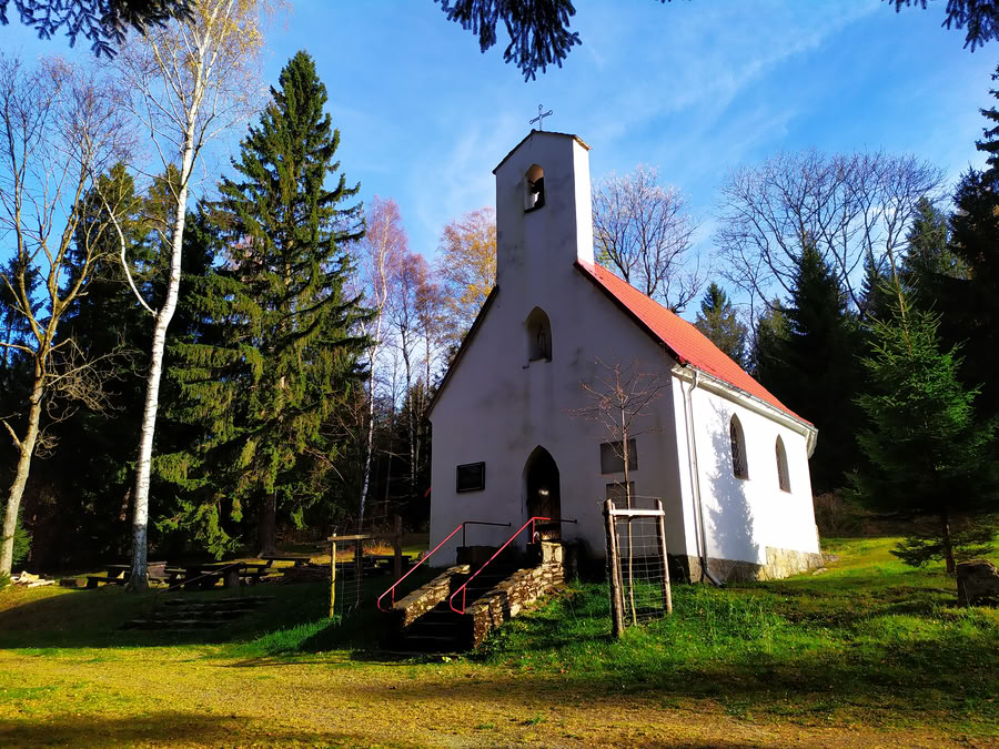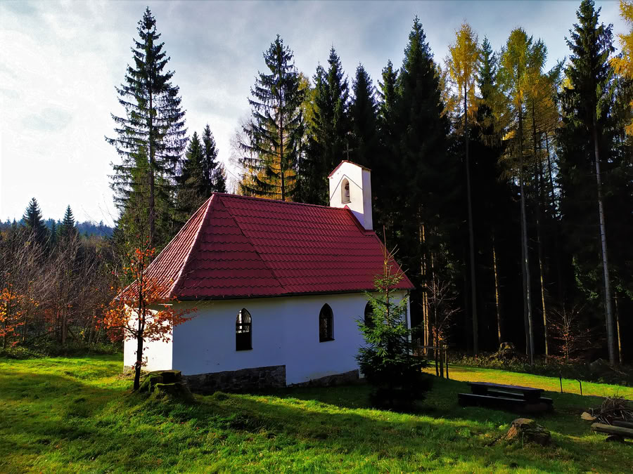První polovina výletu směřuje přes polskou část Rychlebských hor, které z této strany hranice pojmenovali jako Zlaté hory. Zelená směrem na jih ze sedla Lądecka směřuje kousek po silnici a následně odbočuje na louky a přes les pod Čedičový vrch (746 m). Tady je třeba hlídat odbočky zelené, lze je lehce přehlídnout. Po necelých dvou kilometrech od Čedičového vrchu se nachází kostel Matky Boží. Ten je jediným pozůstatkem po bývalé obci Karpno. Tato obec, dříve zvaná Karpenstein, vznikla již ve středověku a tvořila podhradí nedalekého stejnojmenného hradu, o kterém si povíme níž.