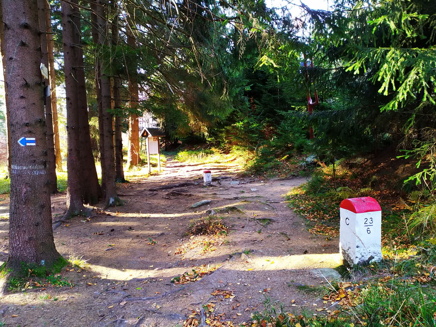 Na mapě výše je vyznačený popisovaný okruh. Start a cíl je na parkovišti v Landeckém sedle (Przelecz Ladecka). Bod číslo 2 – kostel Matky Boží a zaniklá obec Karpno, bod č. 3 – Trojak, bod č. 4 – zřícenina hradu Karpień, bod č. 5 – sedlo Černý kout, bod č. 6 – vrchol Koníček, bod č. 7 – lesní bar u Stříbrného pramene, bod č. 8 – rozcestí Rozhraní. Jedná se o příjemný výlet a stoupání nejsou tak náročná, jelikož se začíná v sedle s výškou 665 metrů.