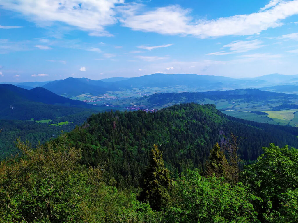 Výhled z Hrdoše směrem na Malou Fatru. Vrchol je jinak celý zalesněný.