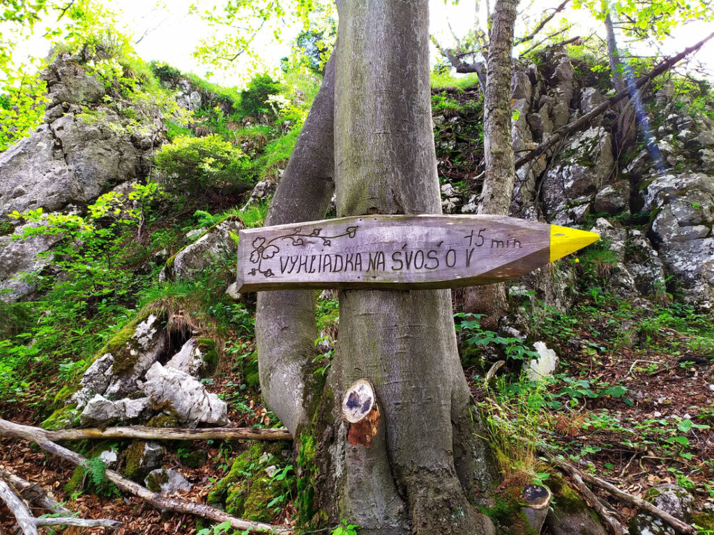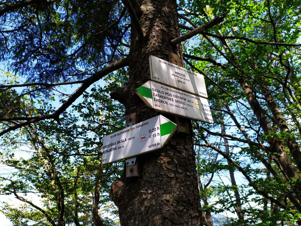 Kousek pod vrcholem Ostré se od žluté odpojuje zelená značka směřující na Hrdoše. Chodníček se proplétá mezi vápencovými skalkami. Po krátkém stoupání se vám najednou otevře výhled na Malou Fatru z vrcholového skaliska Hrdoše. Z Hrdoše se mírně sestupuje až na Hrdošnou skalu. Tady váš uchvátí nejen výhledy na Chočské vrchy a Oravskou Maguru, ale i samotná výška skály. Jen kousek vyhlídky je opatřen dřevěným zábradlím. Hned za vyhlídkou následuje sestup mezerou mezi skalisky, který je zajištěný řetězem. Tím se dostanete pod Hrdošnou skalu, v jejíž stěně se vyjímá vcelku velké skalní okno. Průchod přes okno je také po řetězu. Za ním se nachází menší Žaškovská jeskyně.