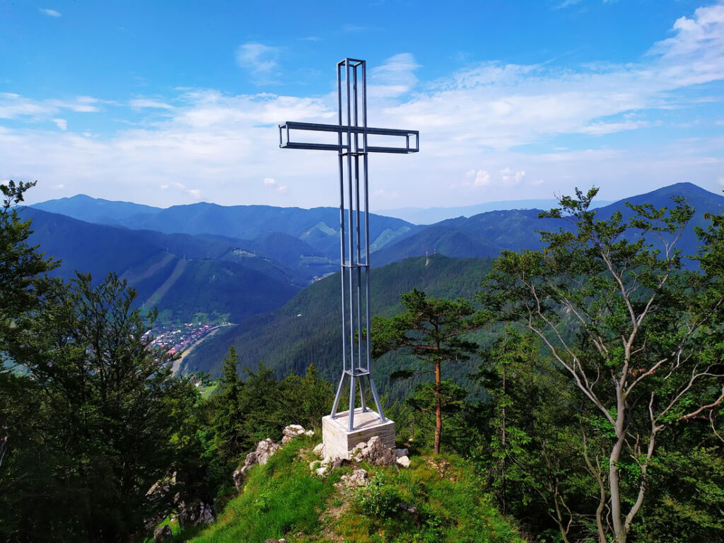 Kříž je jihozápadně od vrcholu. V pozadí Velká Fatra. Nevím, jestli je tohle místo myšleno jako vyhlídka na Švošov – může být ještě níž. Chodník pokračuje dál a měl by se měl napojit na žlutou kousek od sedla pod Ostrým.