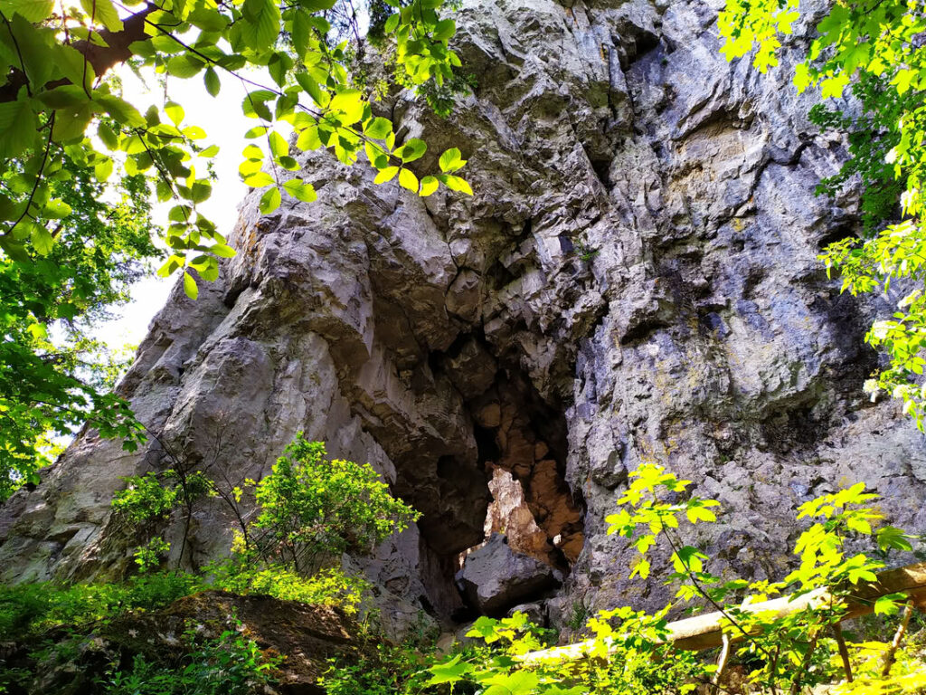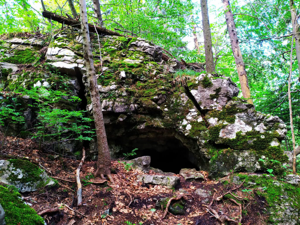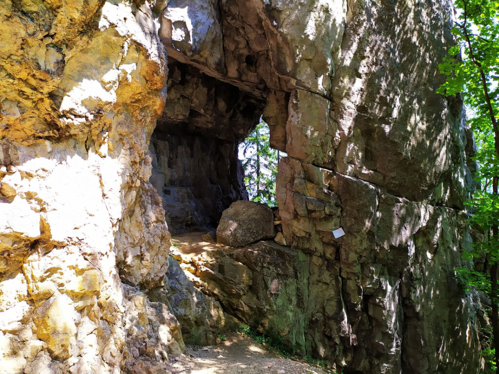 Cestou po zelené od Ostré na Hrdoše se míjí několik skalek – v této i malá jeskyně.