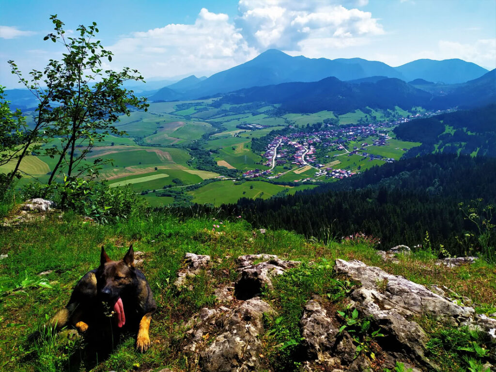 Na Hrdošné skale. Výška stěny vás buď uchvátí nebo vystraší. Výšku odhaduji minimálně na 60 -70 metrů. Vrcholy stromů jsou hodně nízko. V pozadí jsou Chočské vrchy s nejvyšším Velkým Chočem. Dole je obec Komjatná.