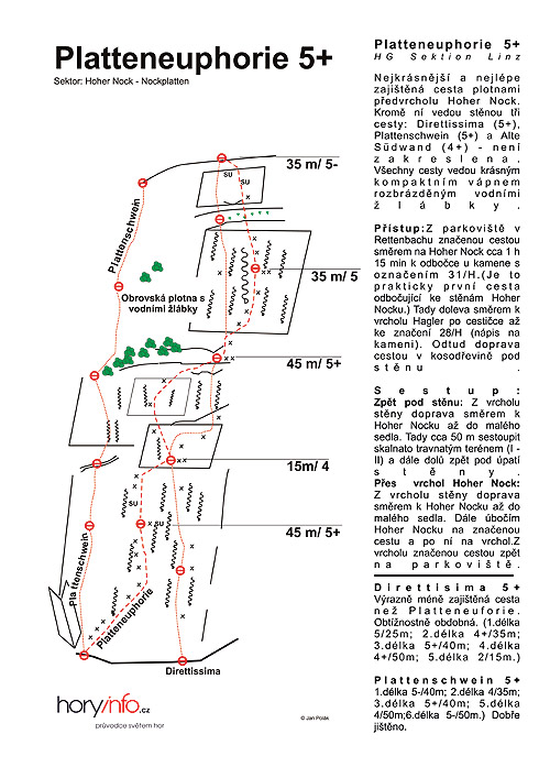 Na začátek je třeba uvést, že stěna zvaná Nockplatte vysoká 180 metrů a tvořící vedlejší vrchol Hoher Nocku, se nachází v nadmořské výšce téměř 1800 metrů. To znamená, že s veškerým lezeckým materiálem se pod nástup překonává z údolí přes 1100 výškových metrů. Podle rakouských průvodců byste se měli pod stěnu dostat za 2 hodiny. Tento čas určitě platí pro běžce, protože i při svižné chůzi jsme se pod 2,5 hodiny nedostali (takže počítejte klidně i 3 hodiny). Samotná cesta Platteneuphorie hodnocená za V+ má pět délek. Orientace ve stěně není náročná, neboť je cesta velmi dobře zajištěná nýty. Takže se leze od nýtu k nýtu.