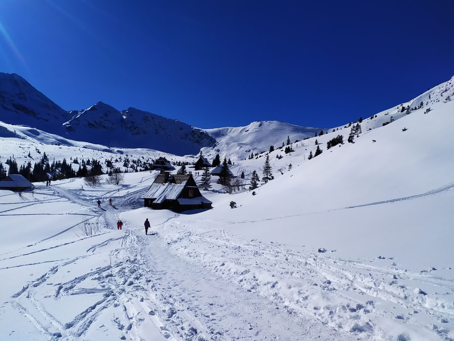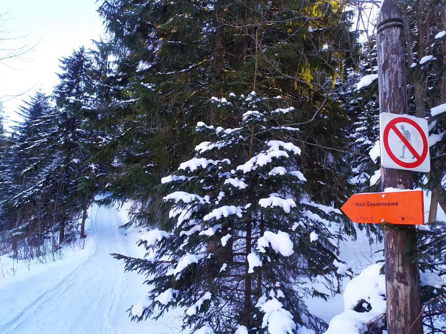 Nejdřív se z centra Kuźnic přechází přes most, za kterým je nutné uhradit vstup do národního parku. Za kasou a dalším mostem máte na výběr, jestli se vydáte rovně po modré turistické značce nebo do leva po čistě lyžařské trase – obě se totiž protnou před sjezdem k chatě Murowaniec. Lyžařská varianta je značená pouze dřevěnými ukazateli (směr Hala Gąsienicowa) na křižovatkách a v terénu červenými tyčemi. Cesta není nijak orientačně náročná a je výrazně prošlapaná, trasa navíc slouží i ke sjezdu. Oříškem pro někoho může být onen sjezd směrem k chatě. Tento 300 metrový a vcelku úzký úsek se totiž běžně sjíždí na pásech. Za sjezdem se otevírají první panoramata na štíty Tater.