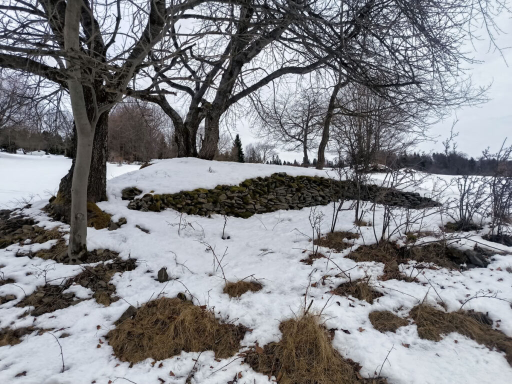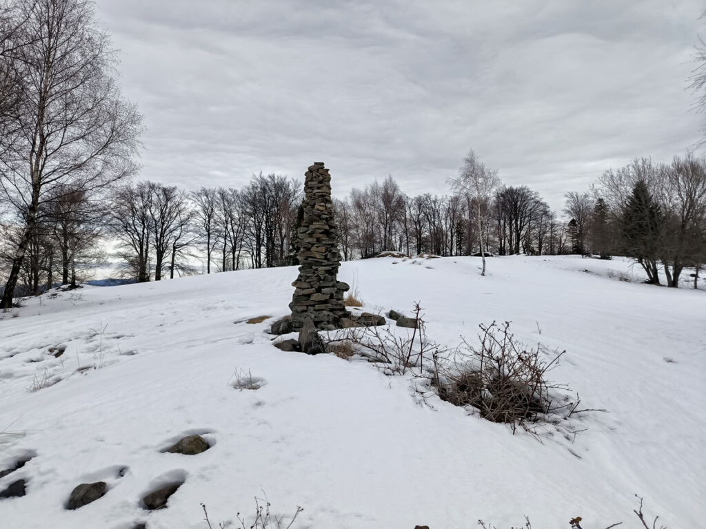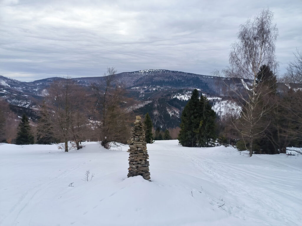 V Lalících se nachází prostorné parkoviště, které je ideálním výchozím bodem trasy. S lyžemi na batohu jsem se musel kousek po žluté přesunout na louky, které se táhnou až na vrchol Zonky (922 m). Během stoupání po zasněžených loukách jsem ucítil, že mé snažení neustále z dálky něco sleduje. Po ohlédnutí jsem zjistil, že na mě shlíží samotná královna Kysuckých Beskyd Velká Ráča. Na loukách v dávných dobách stála nějaká stavení, po kterých zůstaly občasné kupy kamení vytvářející dojem, že jsou to prastaré mohyly. Někdo si dal tu práci a z kamení vystavěl několik úhledných sloupů.