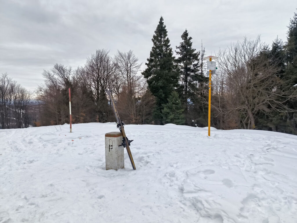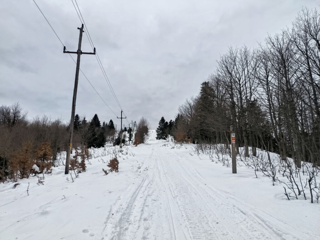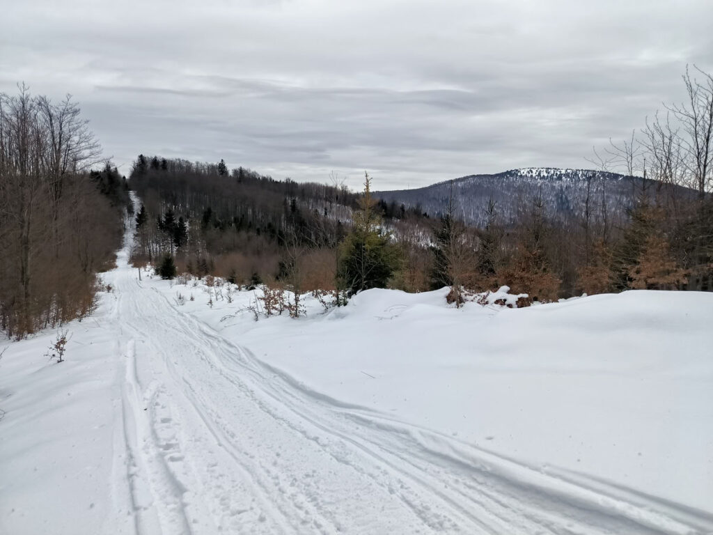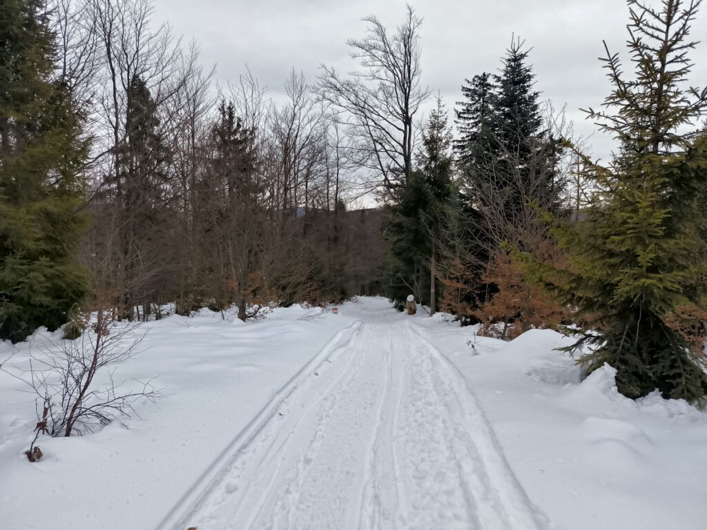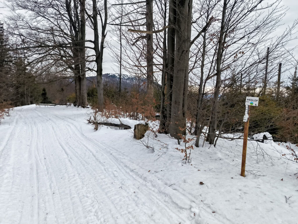Za Zonkou začalo stoupání lesem na vrchol Kykuly (1087 m), která se nachází již na hraničním hřebeni mezi Slovenskem a Polskem. Trasa vedoucí po hřebeni na Velkou Ráču byla k mému překvapení dobře schůdná, protože cestu ujezdily sněžné skútry a vytvořily tak dálnici. Za nedalekou Magurou (1073 m) jsem sundal pásy a nějakých 700 vzdálenostních metrů jsem sjel do sedla. Červená hřebenovka se ještě nějakou dobu drží hranice, ale následně míjí z polské strany vrcholy Malý Príslop (985 m) a Veľký Príslop (1044 m). Já jsem se vydal přes oba vrcholy, které jsem vždy raději sešel dolů pěšky, protože sundávat pásy se mi nechtělo a sjíždět po nich se mi zdálo sebevražedné.
