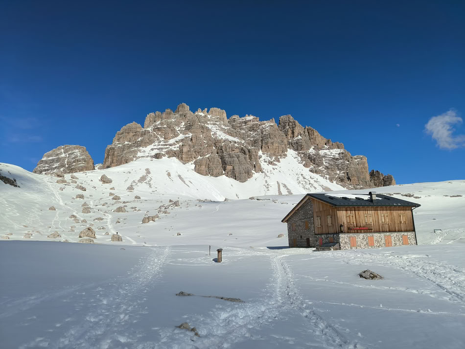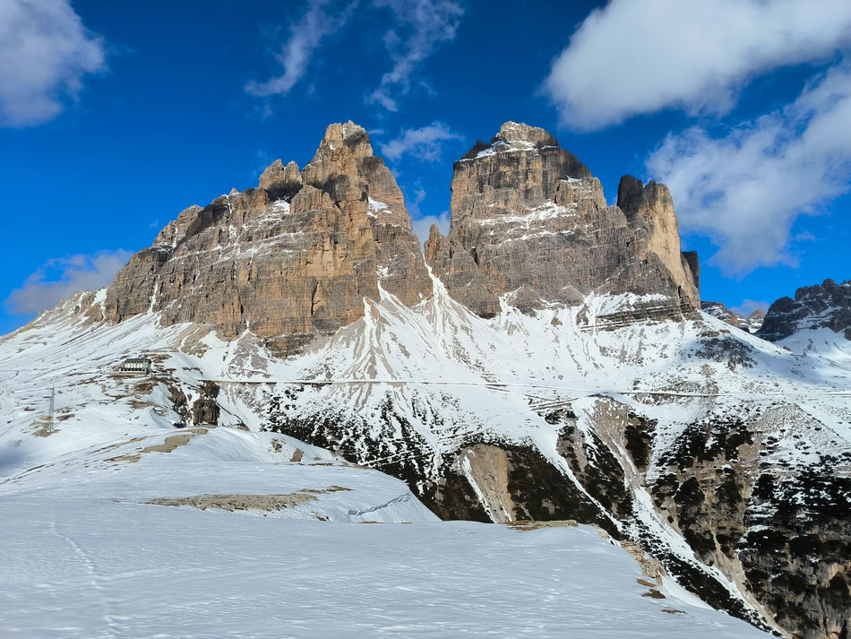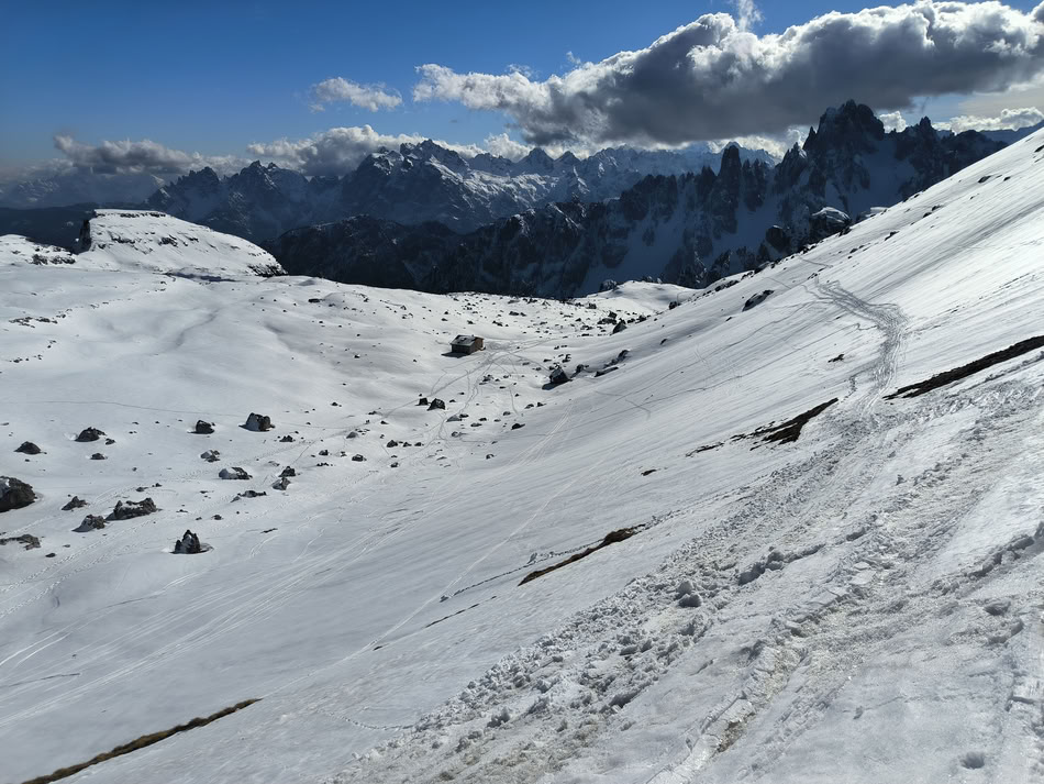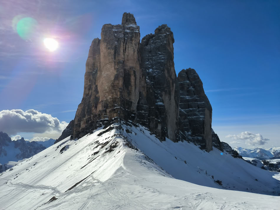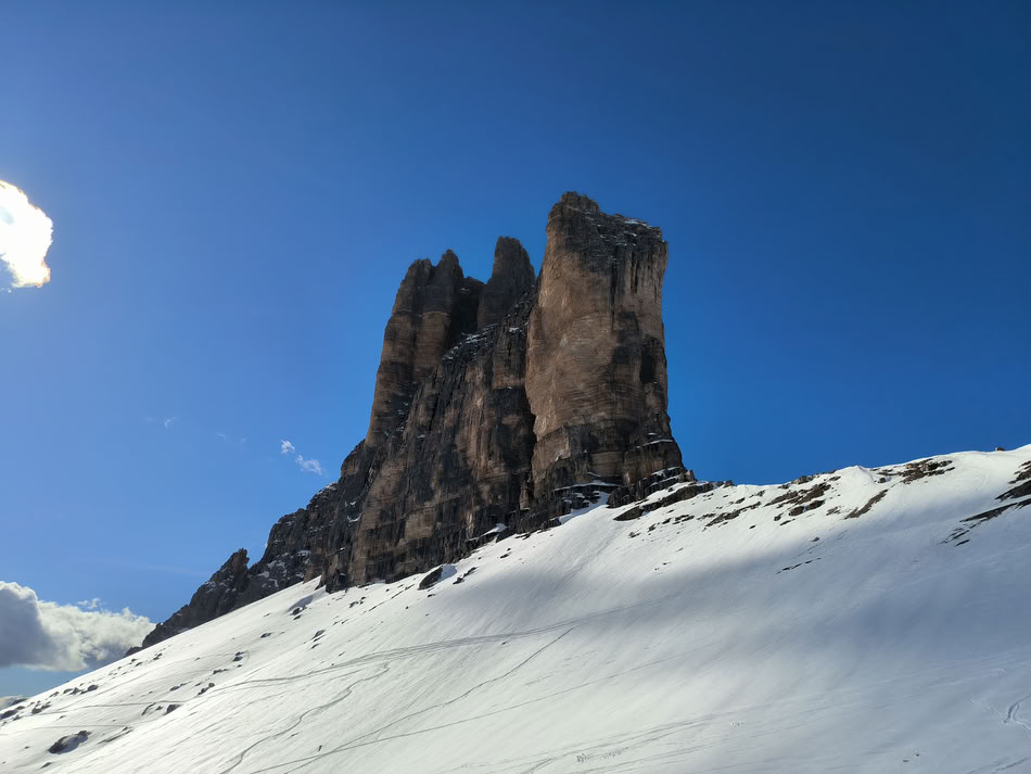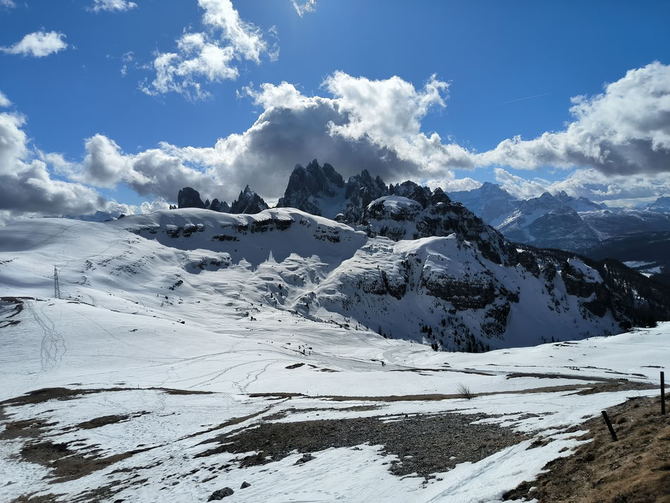 Pod Tre Cime se lze dostat velmi snadno od jezera Misurina. V létě můžete vyjet autem po asfaltce k chatě Auronzo a v zimě vás pro změnu nahoru vytáhnou sněžné skútry. A právě z této strany lze uskutečnit lehkou skialpovou túru – kromě toho, že je nutné překonat kolem 650 metrů převýšení. Musím ale dodat, že z této strany těžko budete hledat onen ikonický pohled na majestátní Tre Cime. Já jsem to nijak nestudoval dopředu a jen jsem vytipoval lehkou trasu, abych se seznámil s prostředím okolo Tre Cime. Onen pohled se vám naskytne z opačné severozápadní strany směrem od chaty Dreizinnenhütte.