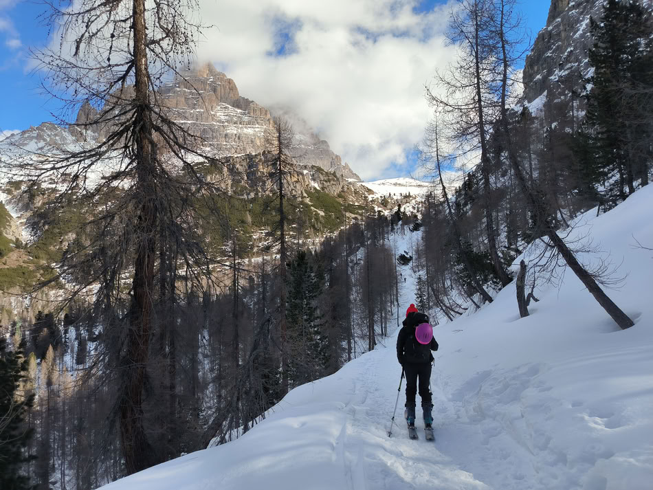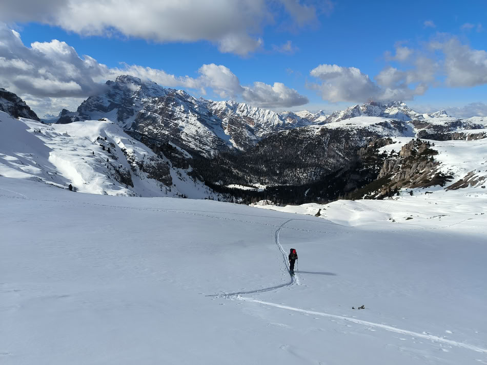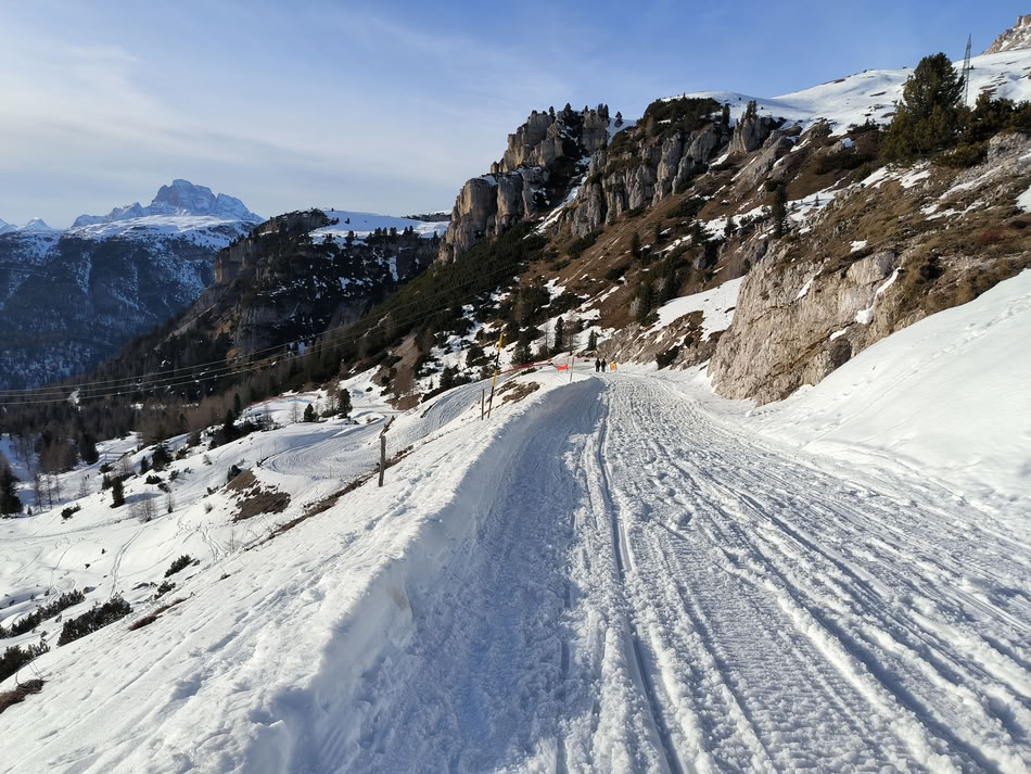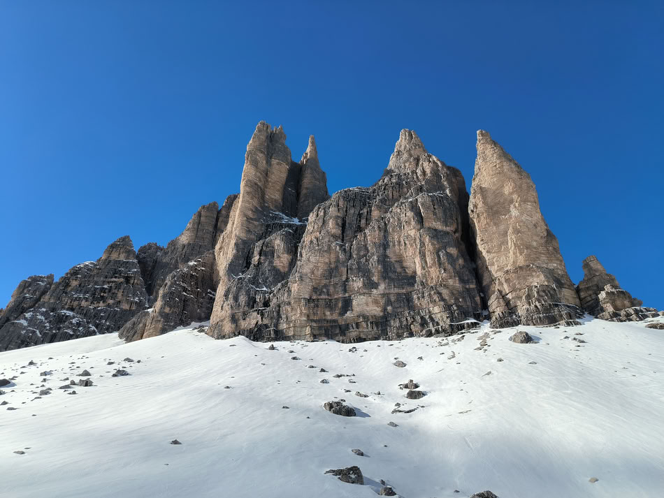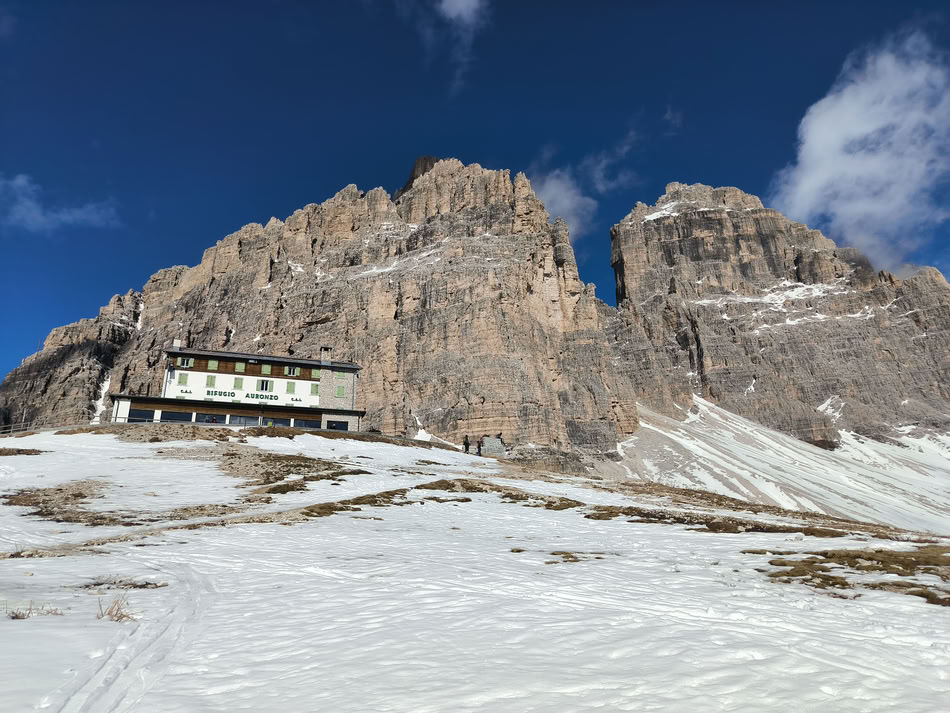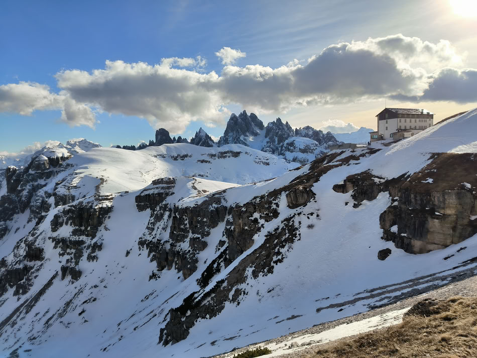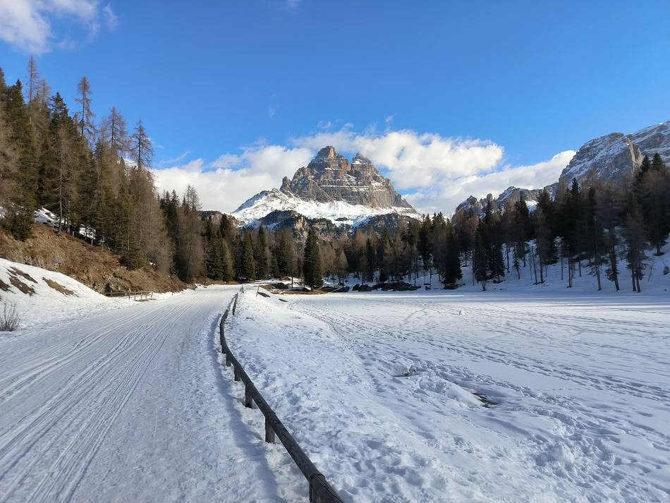 Pod Tre Cime se lze dostat velmi snadno od jezera Misurina. V létě můžete vyjet autem po asfaltce k chatě Auronzo a v zimě vás pro změnu nahoru vytáhnou sněžné skútry. A právě z této strany lze uskutečnit lehkou skialpovou túru – kromě toho, že je nutné překonat kolem 650 metrů převýšení. Musím ale dodat, že z této strany těžko budete hledat onen ikonický pohled na majestátní Tre Cime. Já jsem to nijak nestudoval dopředu a jen jsem vytipoval lehkou trasu, abych se seznámil s prostředím okolo Tre Cime. Onen pohled se vám naskytne z opačné severozápadní strany směrem od chaty Dreizinnenhütte.