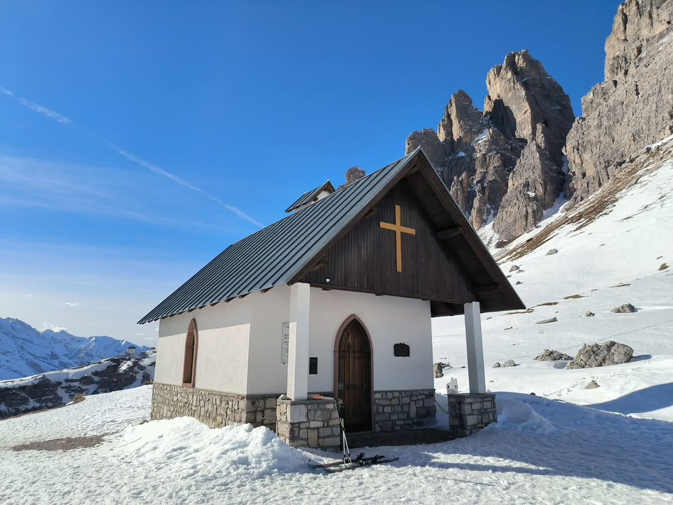 V sedle Lavaredo jsem sundal pásy sjel velmi dlouhým traverzem pod věžemi Cima Piccola až za chatu Lavaredohütte, téměř ke kapli. Od chaty Auronzo se pak sjíždí zasněženou asfaltovou cestou dolů. Z jihu má Tre Cime také své kouzlo – každým krokem mění věže svůj tvar, zejména pak masív nejnižší Cima Piccoly. Jsou to neokoukané pohledy a určitě to stojí za to se sem vydat i z opačné jižní strany. Každopádně pokud se pod Tre Cime ještě někdy vydám, ať už v zimě nebo v létě, tak to určitě naplánuji dokola třech zubů.