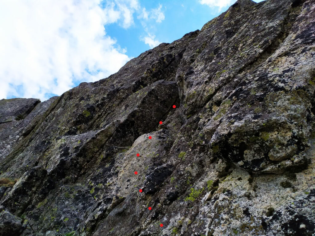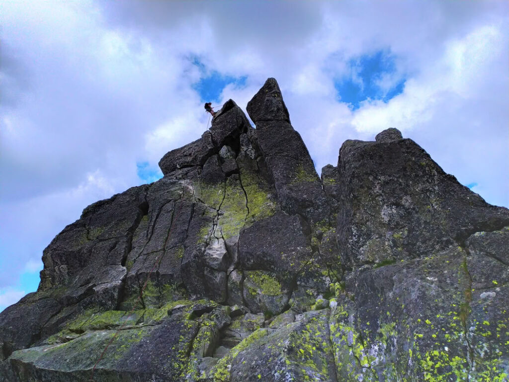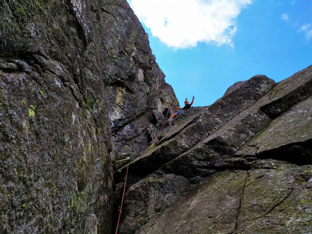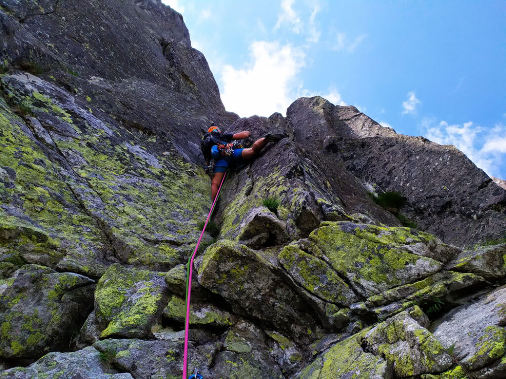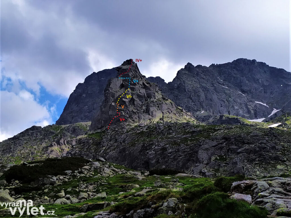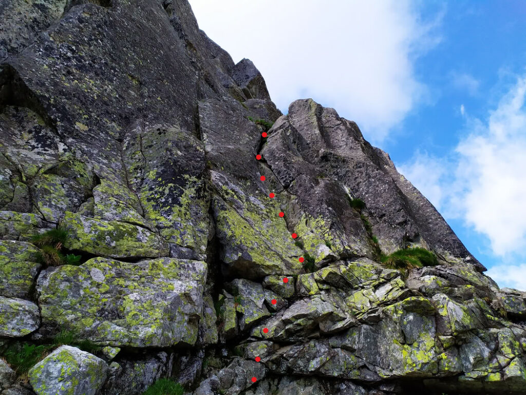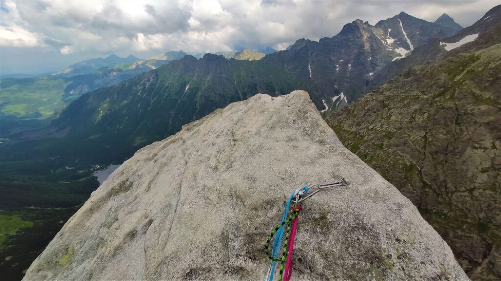 Cesta je velmi působivá, první tři délky vedou ve spárách o různých šířkách. Jakožto neprofesionální lezce spár nás tyhle tři délky pěkně vycvičily. Klíčovou délkou je ta třetí, kde je asi 5 metrů vysoká a vcelku široká spára hodnocená právě obtížnosti VI -. Co je nutné zmínit, že na všech pěti délkách, kromě štandu s řetězy, není jediný fixní jistící bod v podobě borháku nebo nýtu. Po cestě jsou jen 3 staré skoby, což znamená, že je potřeba zakládat vlastní jištění v podobě vklíněnců, hexů nebo friendů. Vrchol je přesně tak prostorný, jak se zdá od Mořského oka – cca 2 x 2 metry. Opět jsme měli lano 2 x 60 metrů, ale postačí i 2 x 50 metrů. Na poslední dvě délky se kvůli ztížené komunikaci hodí vysílačky. Cesta ve vás zanechá silný dojem a v nás konkrétně ještě navíc, že jsme si ten vrchol museli oddřít 😀 .