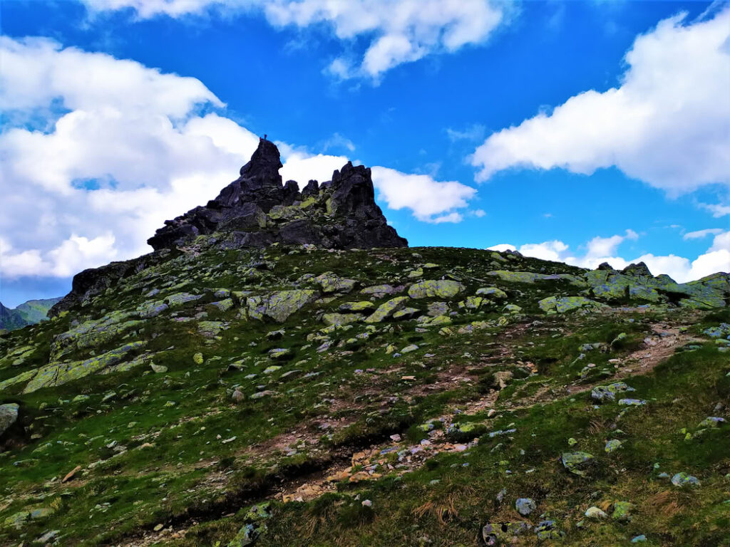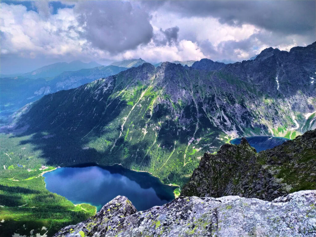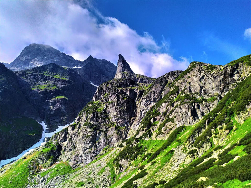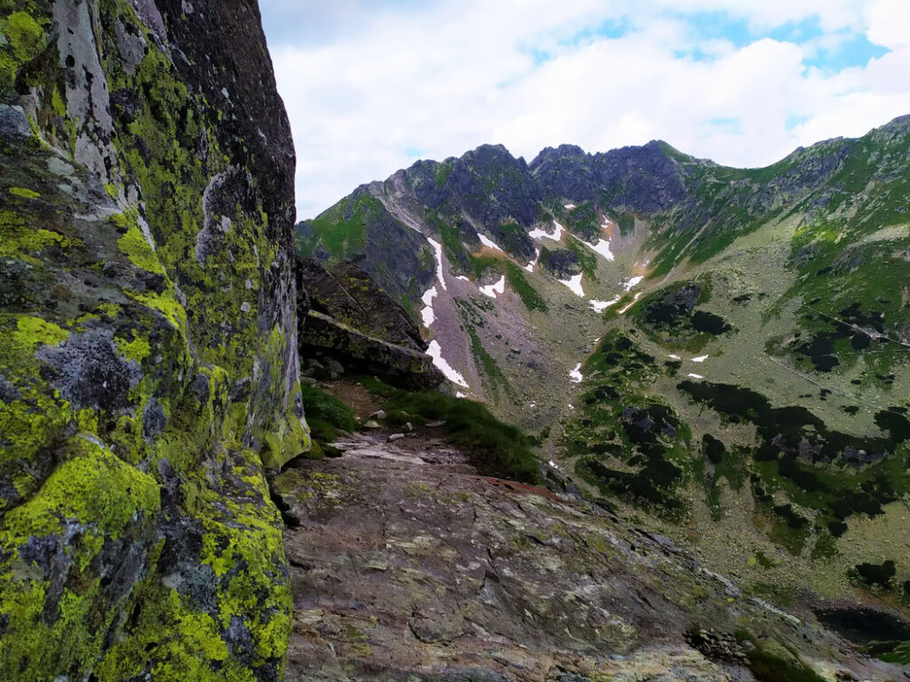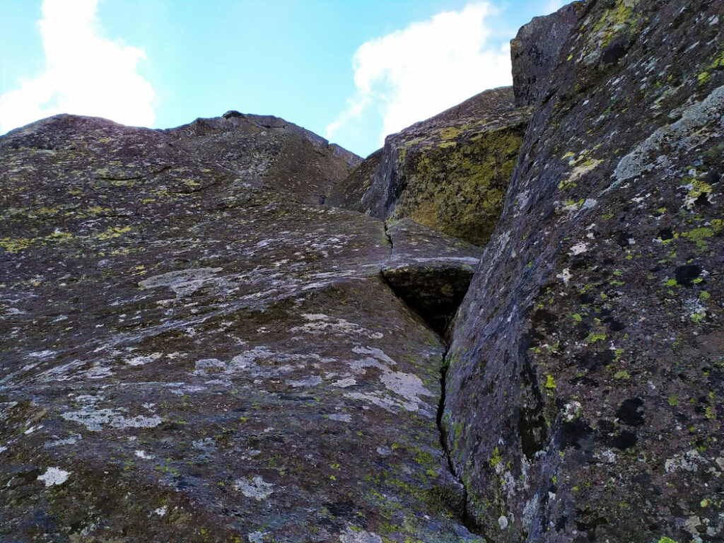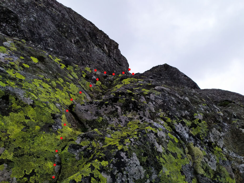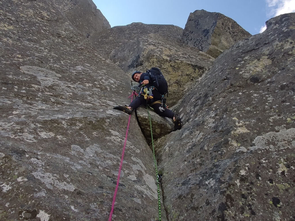 Cesta je velmi působivá, první tři délky vedou ve spárách o různých šířkách. Jakožto neprofesionální lezce spár nás tyhle tři délky pěkně vycvičily. Klíčovou délkou je ta třetí, kde je asi 5 metrů vysoká a vcelku široká spára hodnocená právě obtížnosti VI -. Co je nutné zmínit, že na všech pěti délkách, kromě štandu s řetězy, není jediný fixní jistící bod v podobě borháku nebo nýtu. Po cestě jsou jen 3 staré skoby, což znamená, že je potřeba zakládat vlastní jištění v podobě vklíněnců, hexů nebo friendů. Vrchol je přesně tak prostorný, jak se zdá od Mořského oka – cca 2 x 2 metry. Opět jsme měli lano 2 x 60 metrů, ale postačí i 2 x 50 metrů. Na poslední dvě délky se kvůli ztížené komunikaci hodí vysílačky. Cesta ve vás zanechá silný dojem a v nás konkrétně ještě navíc, že jsme si ten vrchol museli oddřít 😀 .