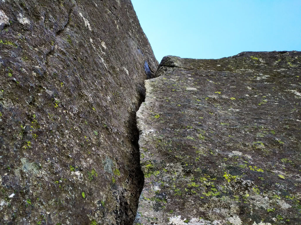 Následuje třetí nejtěžší délka. Spára nad řetězem je hodnocena úrovni VI-, ale možná bych se nebál použít i čistě za VI. Jedná se ale o krátký úsek a po nějaké době se podaří rozklíčovat ty správné pohyby. Důležité je mít větší velikosti friendů (např. vel. 4 RE Axel). Najdeme tam i zaražený hex, který ve spáře zůstane nejspíš navždy. Po tomto úseku se prolézá oddychová část v zářezu za II. Délka končí na rozpukaném balvanu, kde trochu výš nad hlavou najdeme nýt.