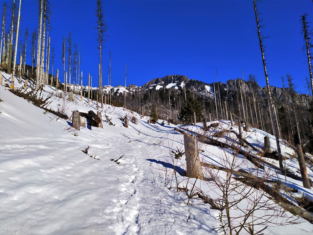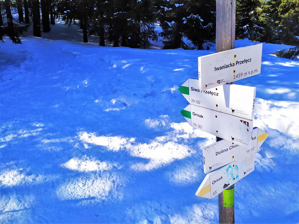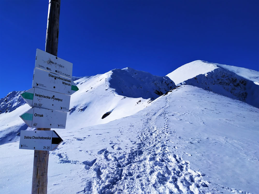 Dolina Kościeliska je považována za nejkrásnější dolinu na polské straně Tater. Aby také ne, když je lemována vápencovými věžemi a stěnami s mnoha jeskyněmi. Toto údolí má také za sebou bohatou těžební minulost. Od 15. století se zde těžilo převážně stříbro a měď a na zpracování stávaly v údolí pece na tavení, mlýn na drcení rudy, dílny ap. V údolí narazíme na několik odboček k jeskyním, které jsou ale v zimě uzavřené. Na konci údolí stojí chata Ornak. Od chaty pak začíná stoupání po žluté do sedla Iwaniacka (1459 m). Toto stoupání do sedla je na rozehřátí, protože poté na vás čeká 300 výškových metrů prudkého stoupání na hřeben Ornaku. A když už se točíme kolem hornického tématu, tak se musíme pozastavit u názvu Ornak. Předpokládá se, že základ názvu tvoří staré německé sloveso orton – ohraničovat a podstatné jméno nak – vrchol. Původní název hory totiž zněl Ortnak, který se v průběhu věků zkrátil na Ornak, což můžeme přeložit jako Hraniční vrch. Hřeben tedy nejspíš tvořil hranici a rozděloval dvě hornická území.