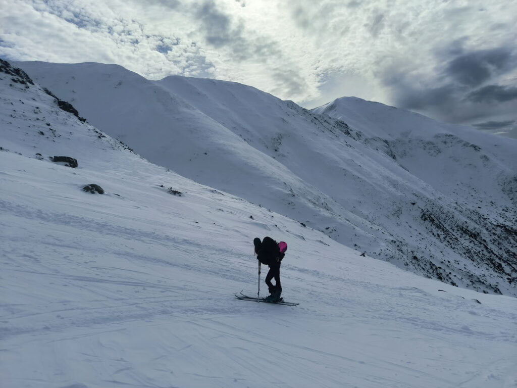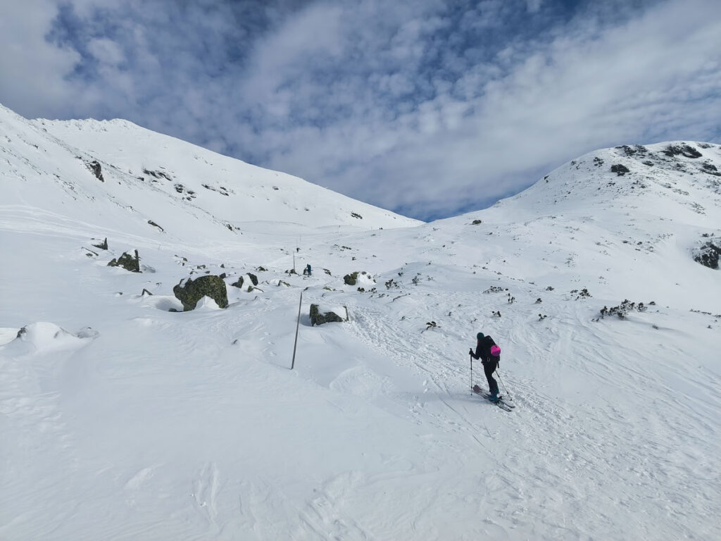 Ještě před rozcestím Homôlka se otevírá údolí, jaké jsem si přestavoval. Široké a s mnoha možnostmi sjezdu. Navíc je sklon údolí mírnější, takže bývá i relativně bezpečné při vyšším lavinovém nebezpečí. Plačlivé se konečně ukázalo v celé své kráse. Verča na chvíli vyvalila oči, když jsem ji vyvedl z omylu, že nejdeme támhle na Homôlku (1847 m) trčící uprostřed Žiarské doliny, která se zdála ze spod jako náš hlavní cíl. "Jdeme támhle na tu špičku!" a pomalu a postupně jsem ukázal průběh hřebene zvedajícího se ze Žiarského sedla na vrchol Plačlivého. Verča zrakem zacílila na vrchol, psychiku přenastavila na jiný cíl a rázným krokem se vydala do sedla.