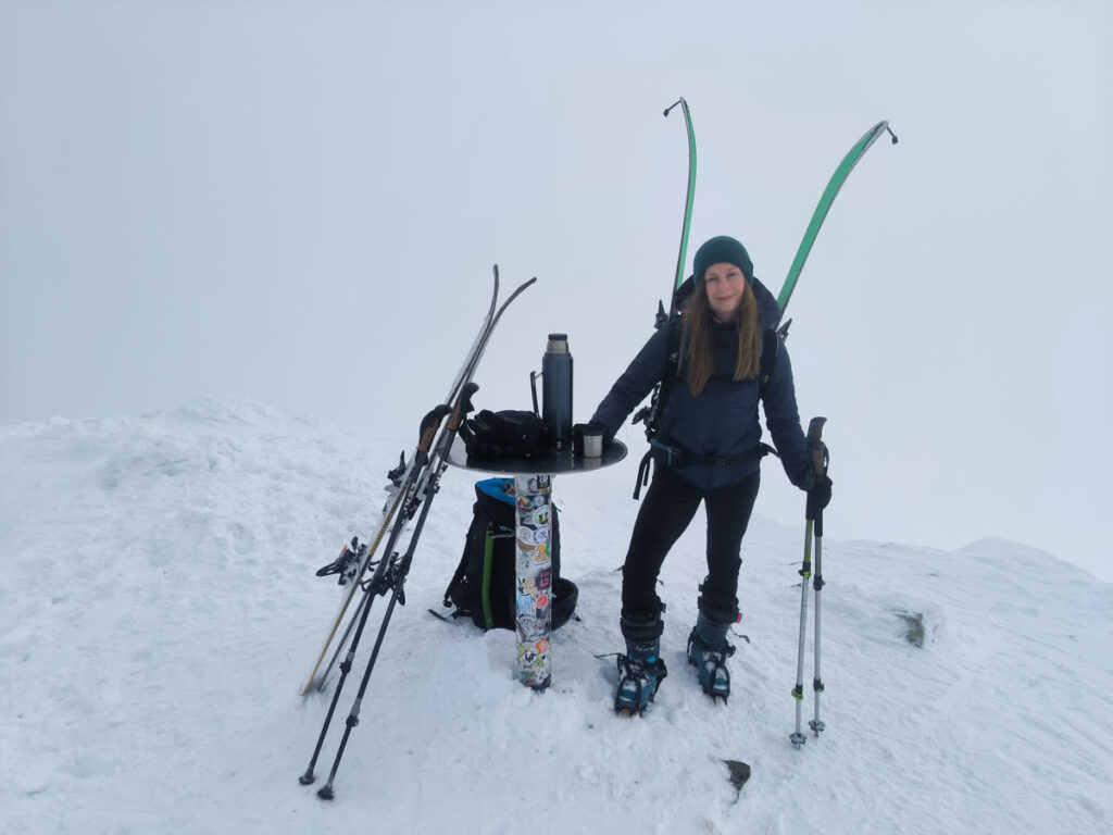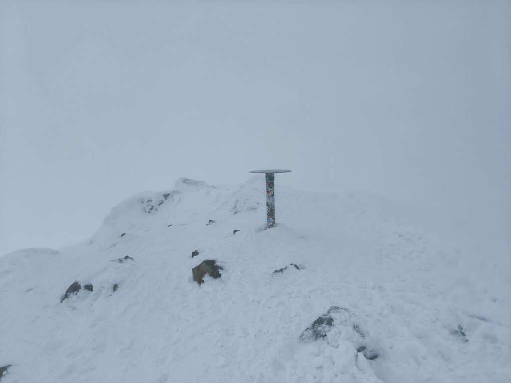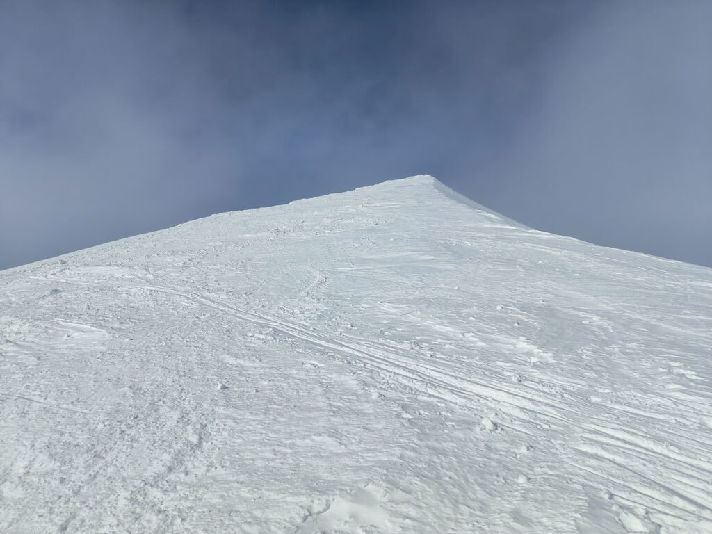 Ze sedla se to zdálo na vrchol ještě pěkný kus a navíc již pod výrazně jiným úhlem stoupání. Verča po chvíli stoupání na pásech odepla lyže a v její tváři jsem uviděl značný neklid. Ten ovšem zmizel jako otočením přepínače, když si nasadila mačky. "Na nohou se cítím bezpečněji." odpověděla a s úsměvem se vydala dokončit poslední desítky výškových metrů zasněžené pyramidy. Jako na potvoru se těsně před dosažením vrcholu snesly mraky. Místo výhledů jsme si v mlze alespoň vychutnali čaj z termosky. Zpět do sedla jsem sjel na lyžích a Verča raději sešla pěšky. Následoval příjemný sjezd po kosodřevinu nad chatou, kde jsme raději kousek přenesli lyže. Se sněhem to bylo v některých sice místech hraniční, ale to nám nezabránilo si užít vysokohorský výšlap na lyžích.